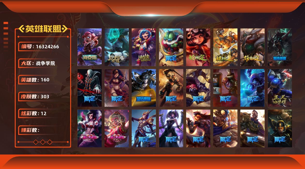 - [16651790]【店主推荐捡漏号】未定级段位-170英雄-487皮肤-28炫彩-3终极-2神话-82限定-34传说-128史诗 【臻彩皮肤】:魔女阿卡丽虚荣 【年限皮肤】:神龙烈焰金克丝,美猴王孙悟空,紫金罗刹莫甘娜,玉净夜叉凯特琳,南天之怒沃里克,春晖神女拉克丝,王国机神苍狼瑟提 【情人节限定】:甜心宝贝安妮 【冰雪限定】:幸福女神乐芙兰,圣诞开心鬼提莫,圣诞精灵崔丝塔娜,圣诞狂欢努努和威朗普,圣诞糖果棒厄运小姐,圣诞狂欢基兰,阿木木“主人不要我了”,胡桃夹子萨科,冰封王子蒙多,平安夜女神娑娜,英勇玩具兵普朗克,邪恶圣诞老人维迦,夺命美人卡特琳娜,喜庆之树茂凯,冬季仙境奥莉安娜,雪默丁格,雪装奈德丽,圣诞玩偶波比,圣诞老人古拉加斯,圣诞驯鹿克格莫,魄罗骑士瑟庄妮,寒冬精灵璐璐,冰雪节辛吉德,冰雪女神辛德拉 【终极皮肤】:大元素使拉克丝,灵魂守卫乌迪尔,未来战士伊泽瑞尔 【神话皮肤】:十周年纪念安妮,神凰行者瑞羽圣凰艾尼维亚 【限定皮肤】:哥特萝莉安妮,钢铁军团拉克丝,暗黑灵魂阿利斯塔,卧虎藏龙贾克斯,诺斯费拉图弗拉基米尔,斩星魔剑易,Fnatic古拉加斯,Fnatic迦娜,暗杀星蒙多,暗杀星努努和威朗普,暗杀星慎,SKTT1劫,SKTT1婕拉,SSW辛吉德,SSW图奇,勇敢的心德莱厄斯,胜利枪神卢锡安,胜利之王泰达米尔,胜利巨口克格莫,海贼瑞兹,南瓜头费德提克,鬼影重重魔腾,鬼影森森茂凯,无头骑士赫卡里姆,魅惑女巫奈德丽,糖果使徒费德提克,泳池派对厄运小姐,泳池派对菲奥娜,泳池派对格雷福斯,泳池派对雷克顿,泳池派对李青,机械迷城加里奥,蓝色忧郁崔斯特,蒙多蒙多,密林猎手提莫,女猎手希维尔,外星装甲库奇,暗影沃里克,野兽猎人德莱文,野兽猎人瑟庄妮,波比的巧克力工坊,勇者奈德丽,都铎王朝图奇,钢铁之翼艾尼维亚,红桃杰克崔斯特,制胜金球拉莫斯,防暴机器人布里茨,防暴士兵辛吉德,警用试作体K9内瑟斯,克格汪 【传说皮肤】:地狱之门卫士加里奥,魔幻卡牌崔斯特,大天使长米迦勒凯尔,战场女武神凯尔,钢铁之翼凯尔,约德尔国队长提莫,烈焰雄心崔丝塔娜,合金巨兽努努和威朗普,女皇艾希,源计划联合艾希,绅士科加斯,双重冰晶艾尼维亚,律政大亨蒙多,女主播迦娜,最终BOSS维迦,女警狙击凯特琳,未来战士凯特琳,上古战魂魔腾,银河魔装机神兰博,第三类接触黑默丁格,炼狱魔犬内瑟斯,死亡骑士盖伦,钢铁军团盖伦