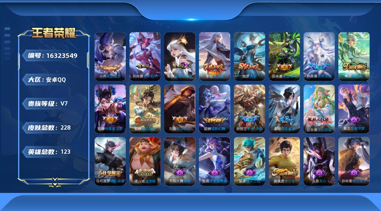 [16323549]按键2 金标貂蝉 安卓Q-228皮肤-1典藏皮肤-11传说-61史诗 【英雄全皮】:猪八戒全皮,影全皮 【荣耀典藏】:小乔天鹅之梦 【传说皮肤】:桑启鸣野蒿,孙尚香异界灵契,貂蝉遇见胡旋,孙悟空零号赤焰,刘备时之恋人,伽罗太华,貂蝉猫影幻舞,虞姬云霓雀翎,貂蝉仲夏夜之梦,李白凤求凰,孙尚香末日机甲 【限定皮肤】:狄仁杰阴阳师,赵云皇家上将,嬴政白昼王子,孙尚香蔷薇恋人,孙尚香异界灵契,庄周高山流水,高渐离玩趣恶龙,芈月幻夜卜梦,吕布猎兽之王,周瑜赤莲之焰,元歌无心,夏侯惇朔风刀,典韦穷奇,马可波罗暗影游猎,狄仁杰魔术师,狄仁杰万华元夜,达摩沙漠行僧,项羽海滩派对,老夫子醍醐杖,貂蝉遇见胡旋,程咬金演武夺筹,兰陵王驯魔猎人,兰陵王金庭之子,孙悟空零号赤焰,李元芳银河之约,李元芳云中旅人,钟馗驱傩正仪,杨玉环遇见飞天,女娲朔望之晖,雅典娜单词大作战,雅典娜黎明之约,蔡文姬繁星吟游,鬼谷子原初探秘者,鬼谷子五谷丰年,黄忠火炮绅士,苏烈千军破阵,百里玄策原初追逐者,弈星混沌棋,梦奇顽趣,沈梦溪星空之诺,沈梦溪大漠名商,明世隐疑决卦,裴擒虎李小龙,裴擒虎擒涛扼浪,狂铁御狮,米莱狄御霄,云中君纤云弄巧,伽罗太华,伽罗天狼溯光者,盾山御銮,猪八戒西部大镖客,猪八戒猪悟能,上官婉儿梁祝,嫦娥拒霜思,蒙犽狂想玩偶喵,鲁班大师探海日志,桑启海盐诗旅,张良古海寻踪,蒙恬荣光圣徽,鬼谷子天穹祈灯,沈梦溪龙舞盛年 【年限皮肤】:李白凤求凰,伽罗太华 【赛季限定】:夏侯惇朔风刀,典韦穷奇,狄仁杰万华元夜,达摩沙漠行僧,老夫子醍醐杖,程咬金演武夺筹,兰陵王金庭之子,张良古海寻踪,李元芳云中旅人,钟馗驱傩正仪,雅典娜黎明之约,鬼谷子原初探秘者,苏烈千军破阵,百里玄策原初追逐者,弈星混沌棋,梦奇顽趣,沈梦溪大漠名商,明世隐疑决卦,裴擒虎擒涛扼浪,狂铁御狮,米莱狄御霄,盾山御銮,鲁班大师探海日志,桑启海盐诗旅,鬼谷子天穹祈灯,蒙恬荣光圣徽 【战令限定】:嬴政白昼王子,芈月幻夜卜梦,吕布猎兽之王,周瑜赤莲之焰,马可波罗暗影游猎,兰陵王驯魔猎人,李元芳银河之约,女娲朔望之晖,雅典娜单词大作战,黄忠火炮绅士,沈梦溪星空之诺,猪八戒西部大镖客,蒙犽狂想玩偶喵 【史诗皮肤】:赵云皇家上将,貂蝉圣诞恋歌,甄姬冰雪圆舞曲,王昭君偶像歌手,狄仁杰魔术师,宫本武藏鬼剑武藏,孙尚香蔷薇恋人,孙尚香水果甜心,妲己魅力维加