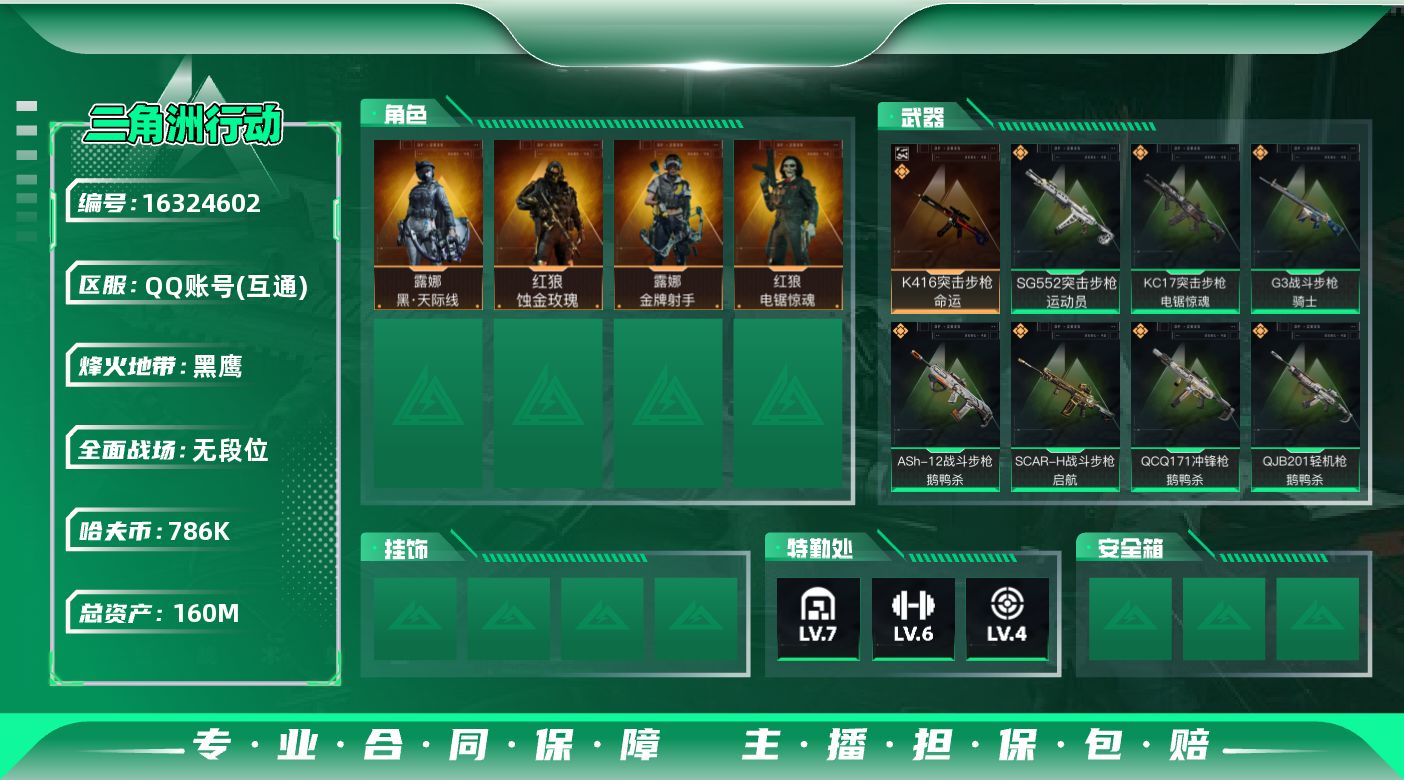 [16324602]【特价出售/店主推荐】160m总资产-786k哈伏币-60烽火等级-黑鹰-2战场等级-无军衔 【干员外观】:红狼-蚀金玫瑰,露娜-黑·天际线,红狼-电锯惊魂,露娜-金牌射手 【近战皮肤】:近战-黑鹰 【典藏外观】:K416突击步枪-命运 【传说外观】:M4A1突击步枪-蚀金玫瑰,M4A1突击步枪-阿米娅,ASh-12战斗步枪-鹅鸭杀,SG552突击步枪-运动员,AK-12突击步枪-特斯拉线圈,SCAR-H战斗步枪-启航,G3战斗步枪-骑士,CAR-15突击步枪-阿米娅,腾龙突击步枪-捞点薯条,KC17突击步枪-电锯惊魂,UZI冲锋枪-特斯拉线圈,SR-3M紧凑突击步枪-特斯拉线圈,勇士冲锋枪-能天使-午夜邮差,QCQ171冲锋枪-鹅鸭杀,M250通用机枪-骑士之心,QJB201轻机枪-鹅鸭杀,AWM狙击步枪-捞点薯条,93R-捞点薯条,复合弓-黑·天际线 【史诗外观】:AWM狙击步枪-私人定制,QBZ95-1突击步枪-曙光,ASh-12战斗步枪-无极限,M16A4突击步枪-竞赛选手,AUG突击步枪-蝮蛇,M7战斗步枪-百步穿杨,SG552突击步枪-深海恐惧,G3战斗步枪-流沙送葬,AS Val突击步枪-典狱官,AS Val突击步枪-百步穿杨,K437突击步枪-守护者,MP5冲锋枪-深海恐惧,MP5冲锋枪-战术竞备,MP5冲锋枪-竞技风,Vector冲锋枪-阿萨拉文明,Vector冲锋枪-百步穿杨,SR-3M紧凑突击步枪-战术竞备,勇士冲锋枪-工业狂潮,MP7冲锋枪-守护者,PKM通用机枪-蝮蛇,Mini-14射手步枪-守护者,SVD狙击步枪-阿萨拉工艺,M14射手步枪-工业狂潮,SV-98狙击步枪-林中猎手,M700狙击步枪-竞技风,M700狙击步枪-百步穿杨,M700狙击步枪-哈夫克警备,AWM狙击步枪-无极限,AWM狙击步枪-流沙送葬,沙漠之鹰-曙光,复合弓-守护者 【稀有外观】:M1014霰弹枪-青纹,M14射手步枪-天际线,M4A1突击步枪-繁盛,AKM突击步枪-战术演练,AKM突击步枪-肃杀,QBZ95-1突击步枪-公平竞技,ASh-12战斗步枪-繁盛,M7战斗步枪-捣蛋鬼,SCAR-H战斗步枪-荣耀列队,SCAR-H战斗步枪-黄昏,G3战斗步枪-战术演练,G3战斗步枪-主宰,PTR-32突击步枪-天网,腾龙突击步枪-冰天雪地,K437突击步枪-天狼星,