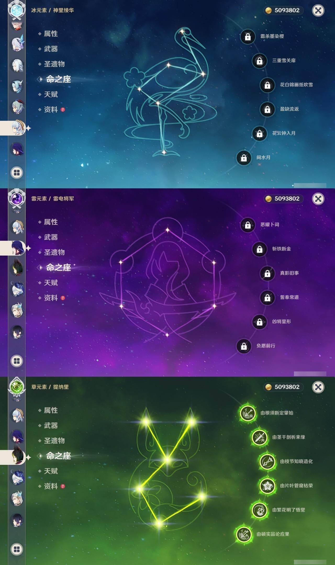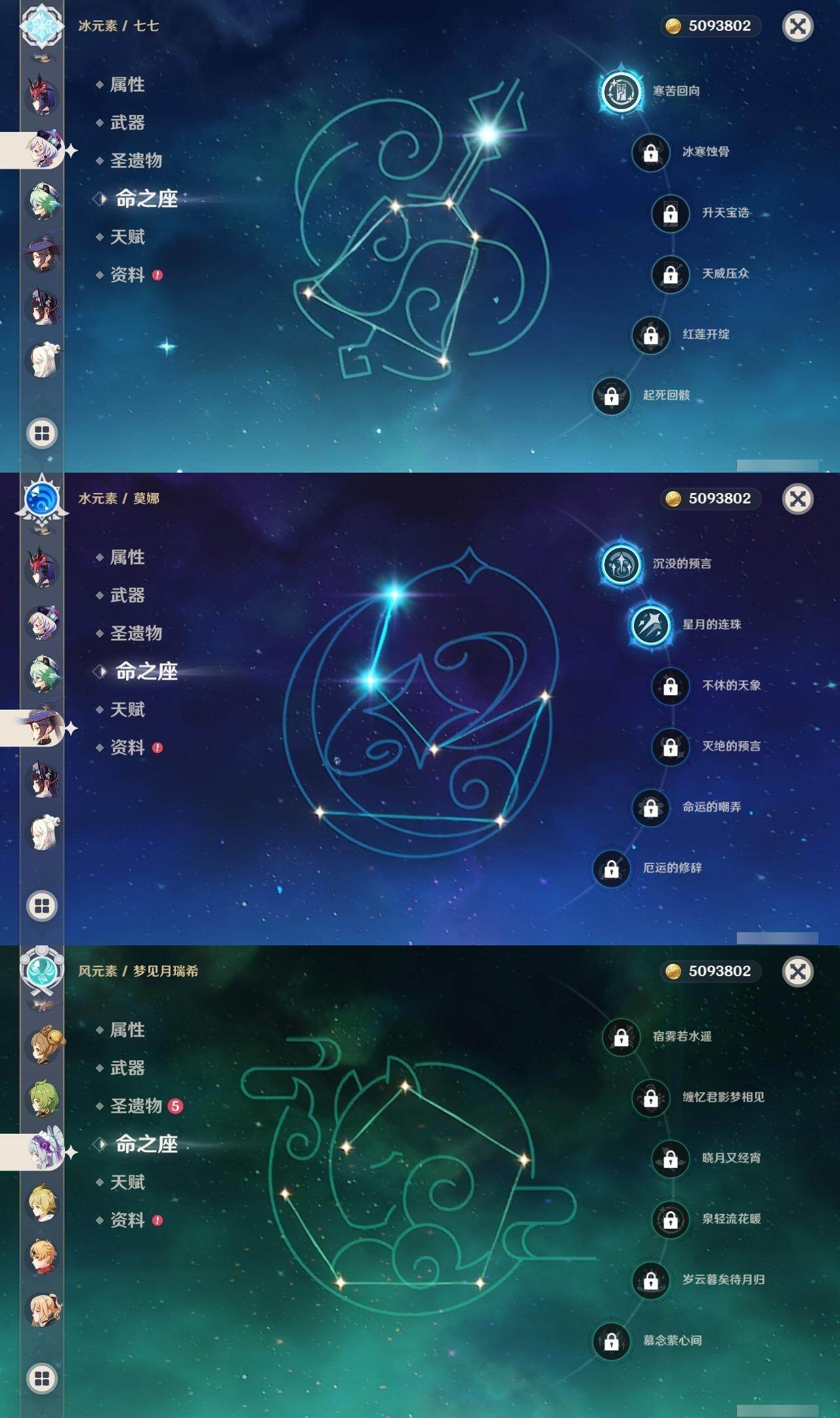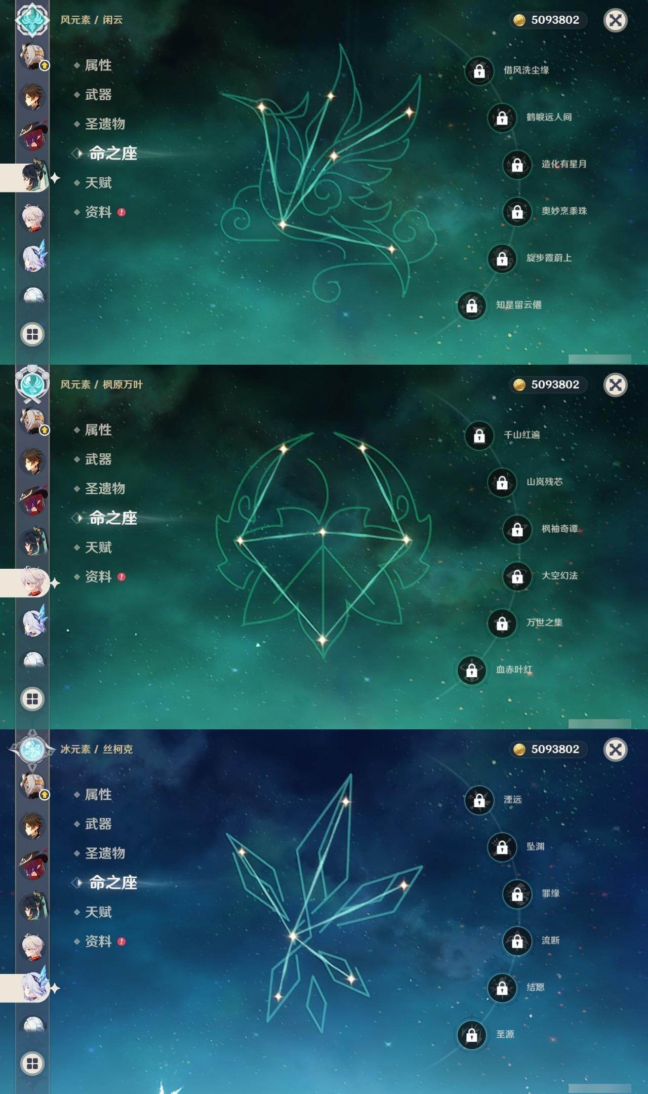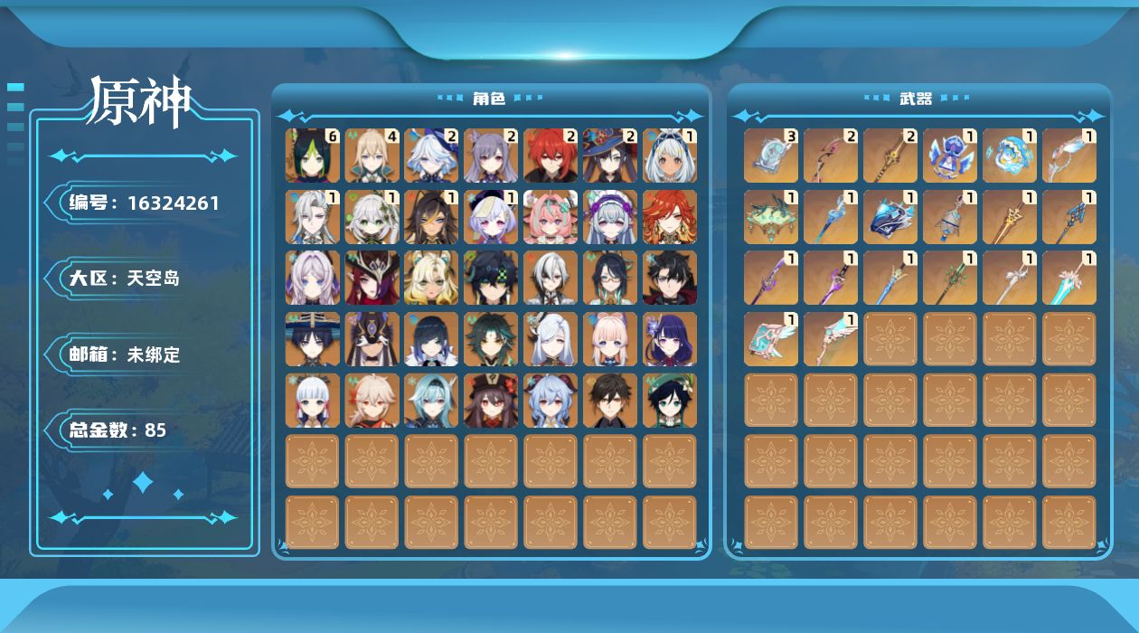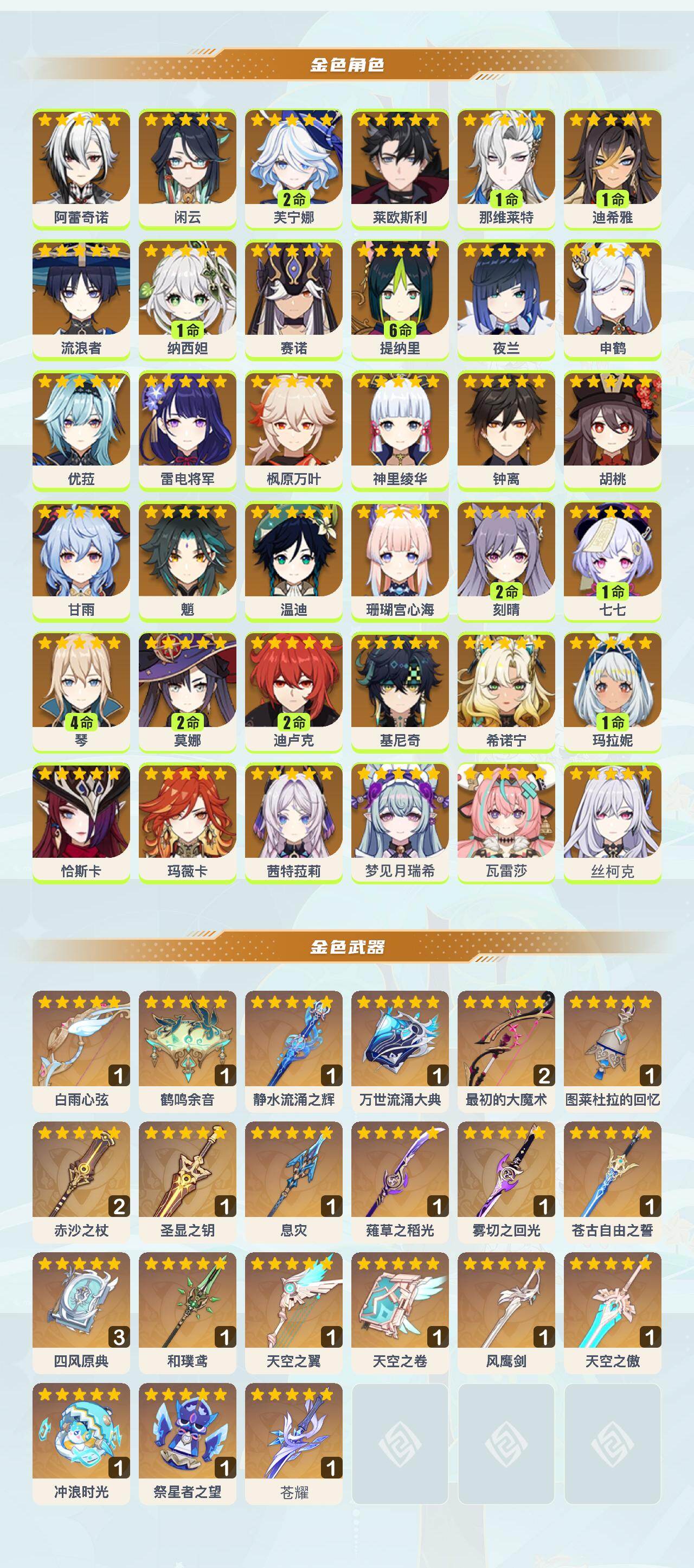 0命阿蕾奇诺,0命闲云,2命芙宁娜,0命莱欧斯利,1命那维莱特,1命迪希雅,0命流浪者,1命纳西妲,0命赛诺,满命提纳里,0命夜兰,0命申鹤,0命优菈,0命雷电将军,0命枫原万叶,0命神里绫华,0命钟离,0命胡桃,0命甘雨,0命魈,0命温迪,0命珊瑚宫心海,2命刻晴,1命七七,4命琴,2命莫娜,2命迪卢克,0命基尼奇,0命希诺宁,1命玛拉妮,0命恰斯卡,0命玛薇卡,0命茜特菈莉,0命梦见月瑞希,0命瓦雷莎,0命丝柯克,精1白雨心弦,精1鹤鸣余音,精1静水流涌之辉,精1万世流涌大典,精2最初的大魔术,精1图莱杜拉的回忆,精2赤沙之杖,精1圣显之钥,精1息灾,精1薙草之稻光,精1雾切之回光,精1苍古自由之誓,精3四风原典,精1和璞鸢,精1天空之翼,精1天空之卷,精1风鹰剑,精1天空之傲,精1冲浪时光,精1祭星者之望,精1苍耀
