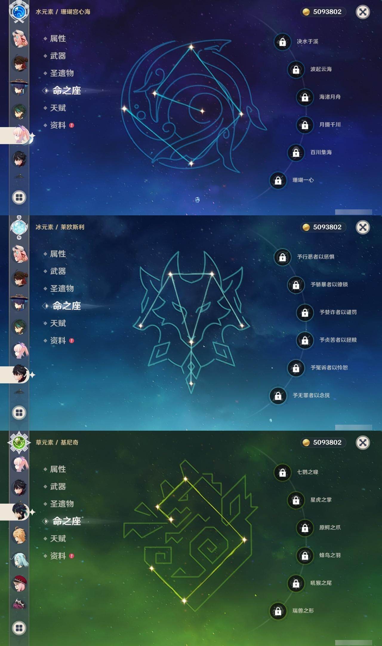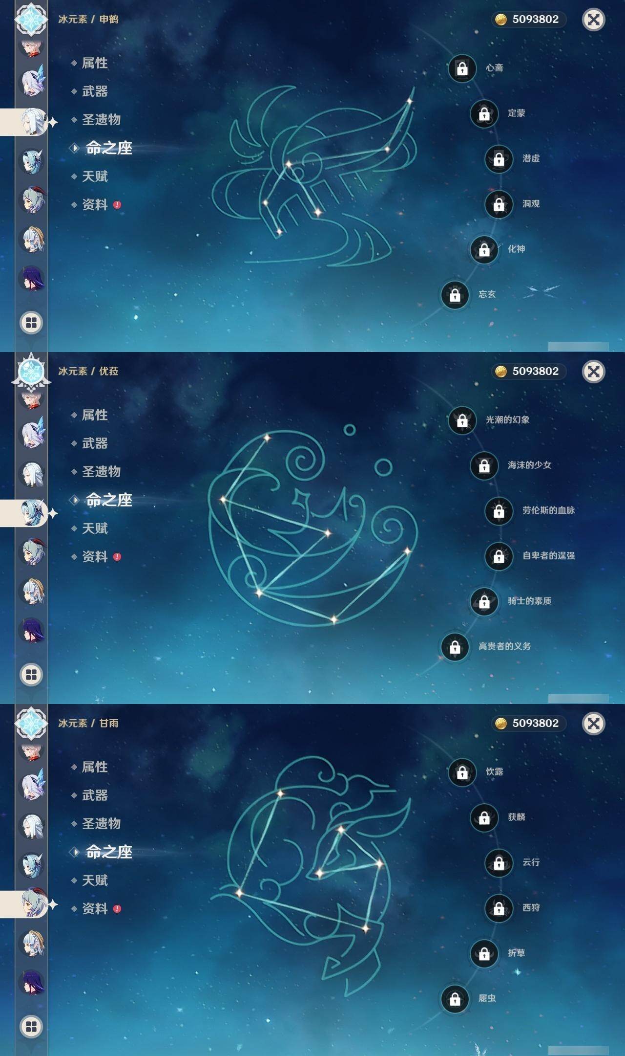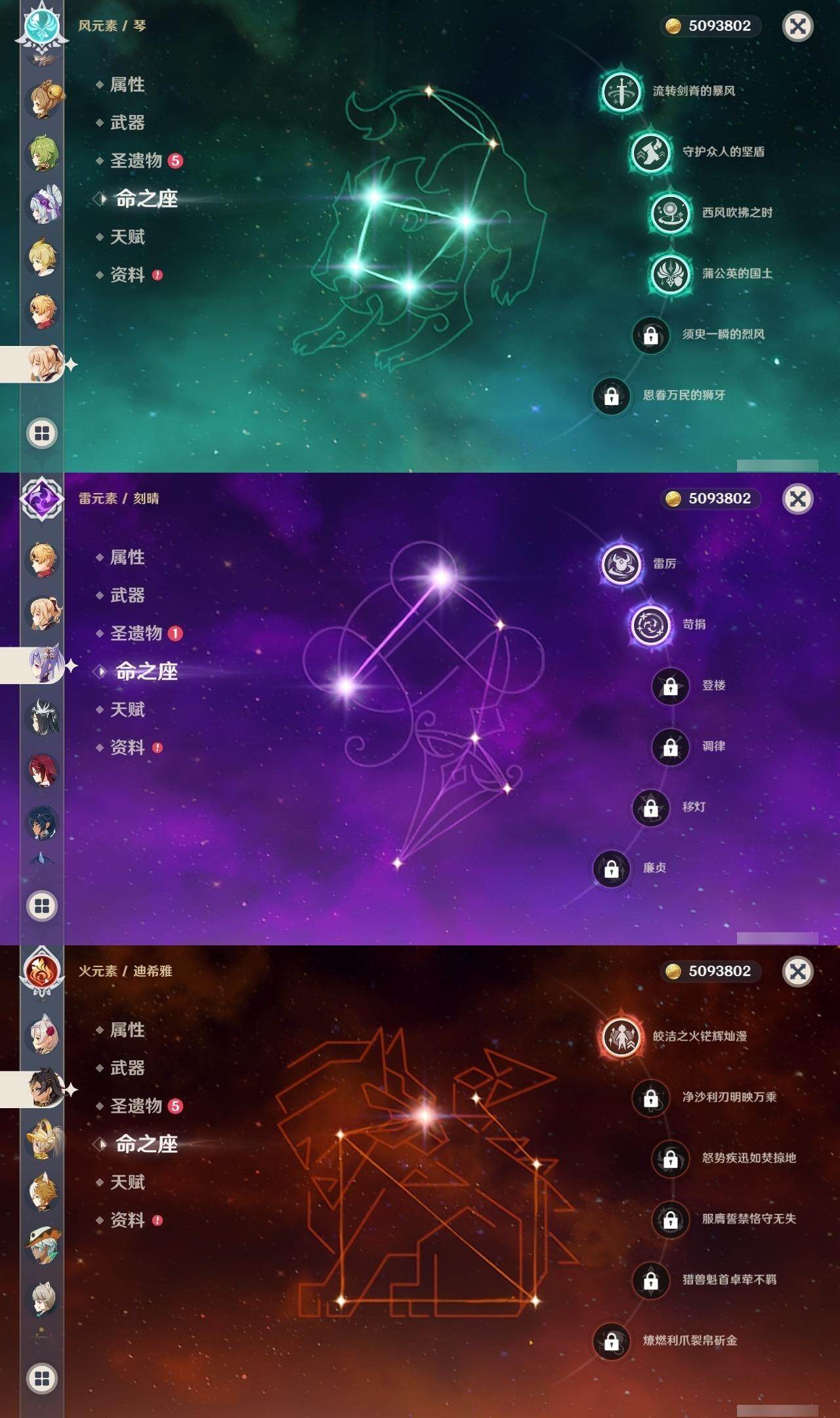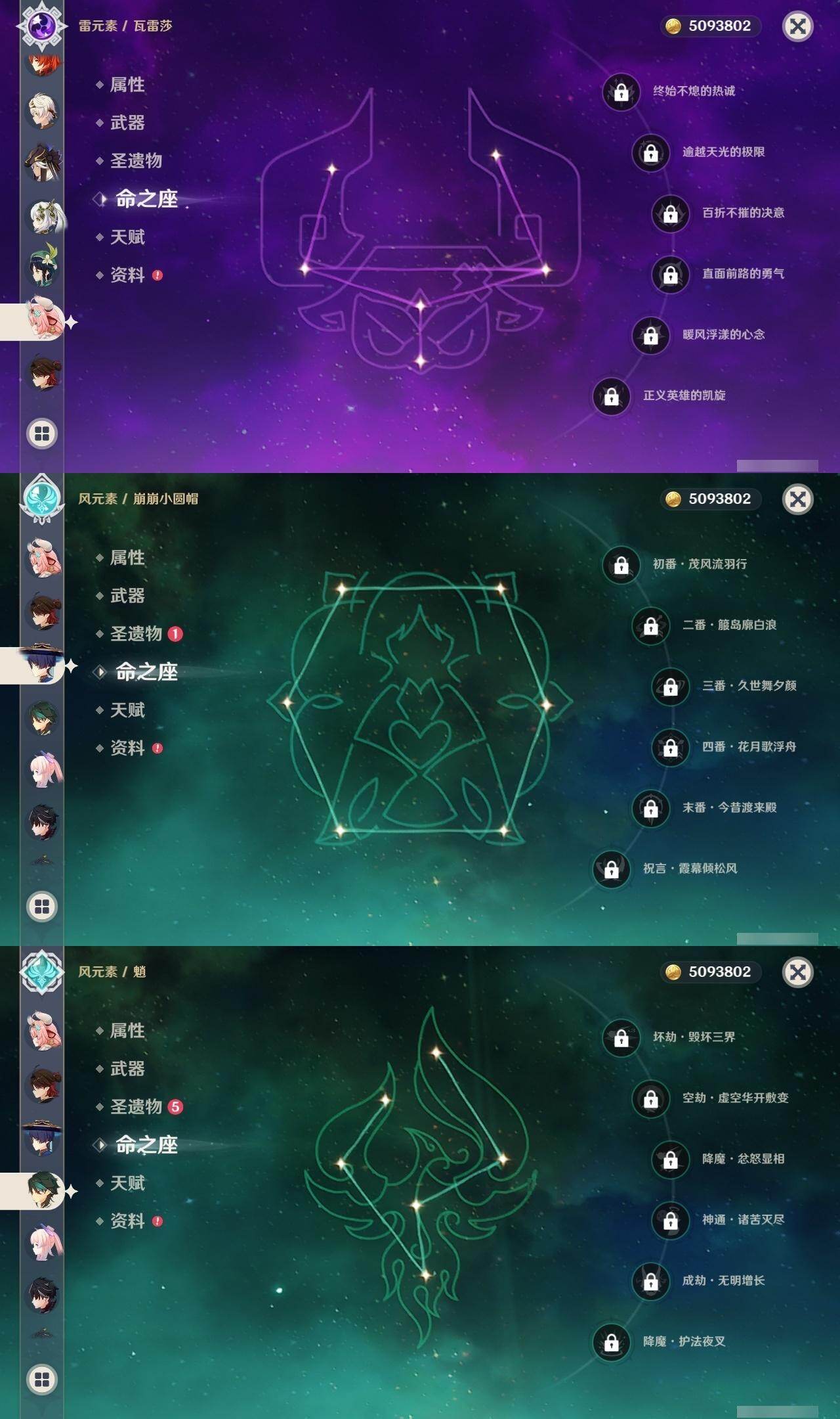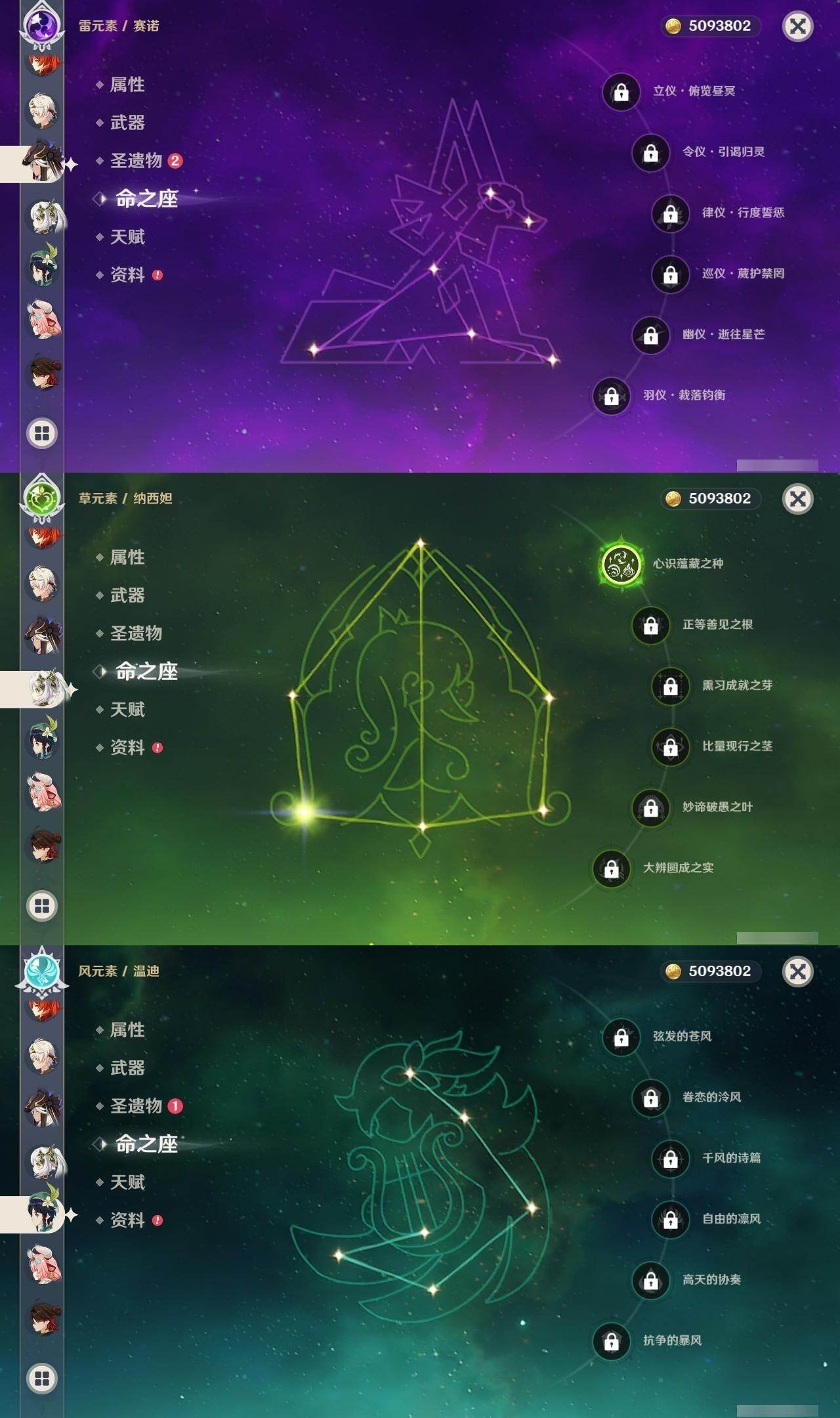 0命阿蕾奇诺,0命闲云,2命芙宁娜,0命莱欧斯利,1命那维莱特,1命迪希雅,0命流浪者,1命纳西妲,0命赛诺,满命提纳里,0命夜兰,0命申鹤,0命优菈,0命雷电将军,0命枫原万叶,0命神里绫华,0命钟离,0命胡桃,0命甘雨,0命魈,0命温迪,0命珊瑚宫心海,2命刻晴,1命七七,4命琴,2命莫娜,2命迪卢克,0命基尼奇,0命希诺宁,1命玛拉妮,0命恰斯卡,0命玛薇卡,0命茜特菈莉,0命梦见月瑞希,0命瓦雷莎,0命丝柯克,精1白雨心弦,精1鹤鸣余音,精1静水流涌之辉,精1万世流涌大典,精2最初的大魔术,精1图莱杜拉的回忆,精2赤沙之杖,精1圣显之钥,精1息灾,精1薙草之稻光,精1雾切之回光,精1苍古自由之誓,精3四风原典,精1和璞鸢,精1天空之翼,精1天空之卷,精1风鹰剑,精1天空之傲,精1冲浪时光,精1祭星者之望,精1苍耀