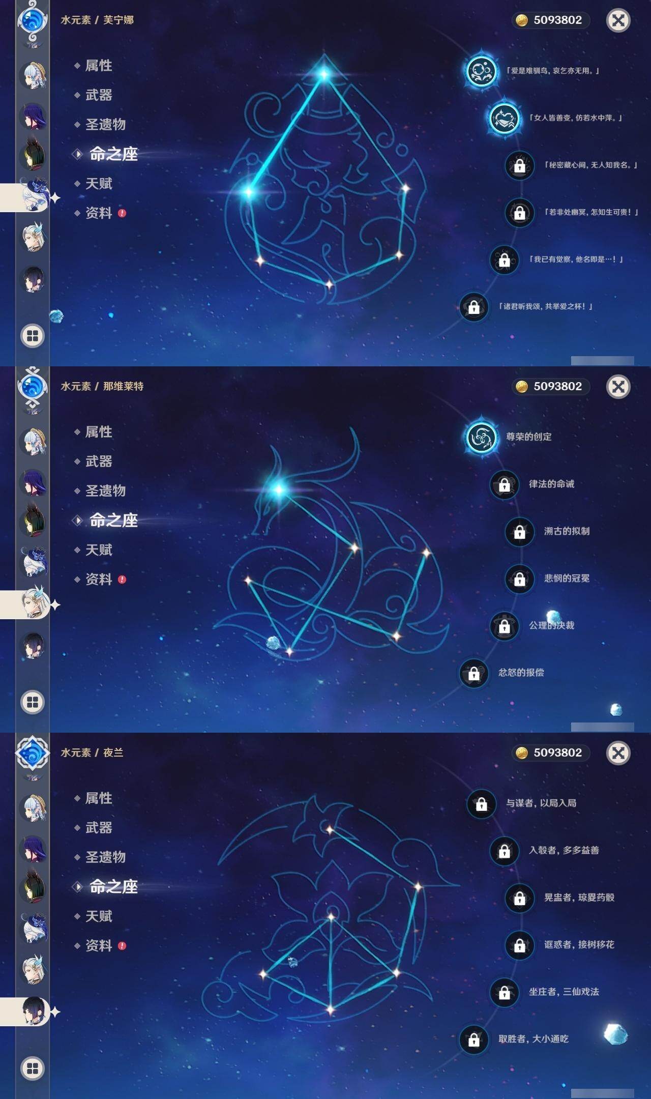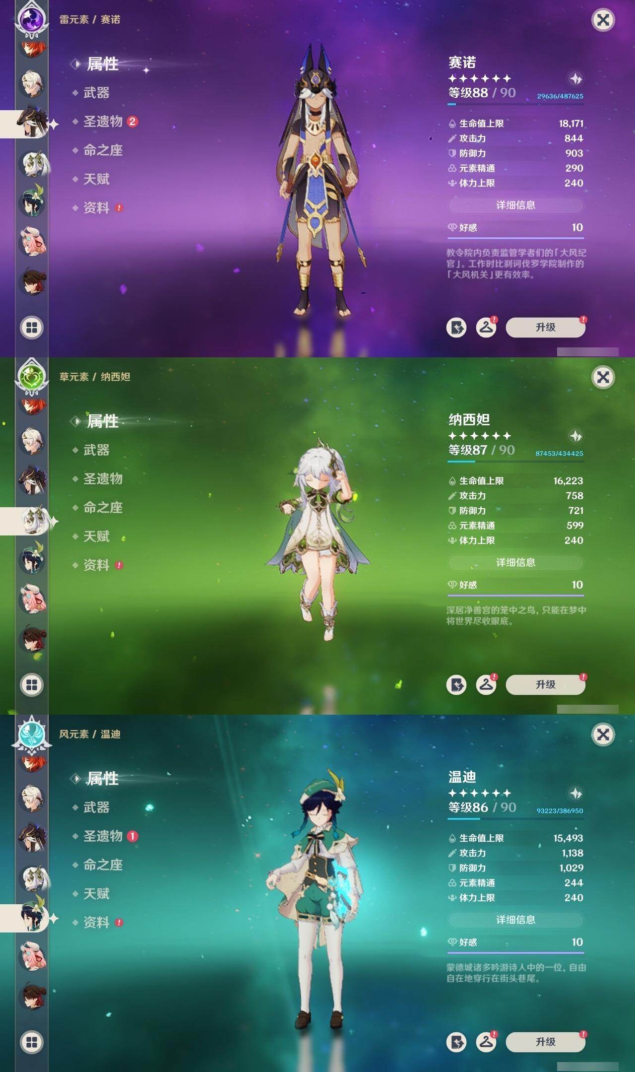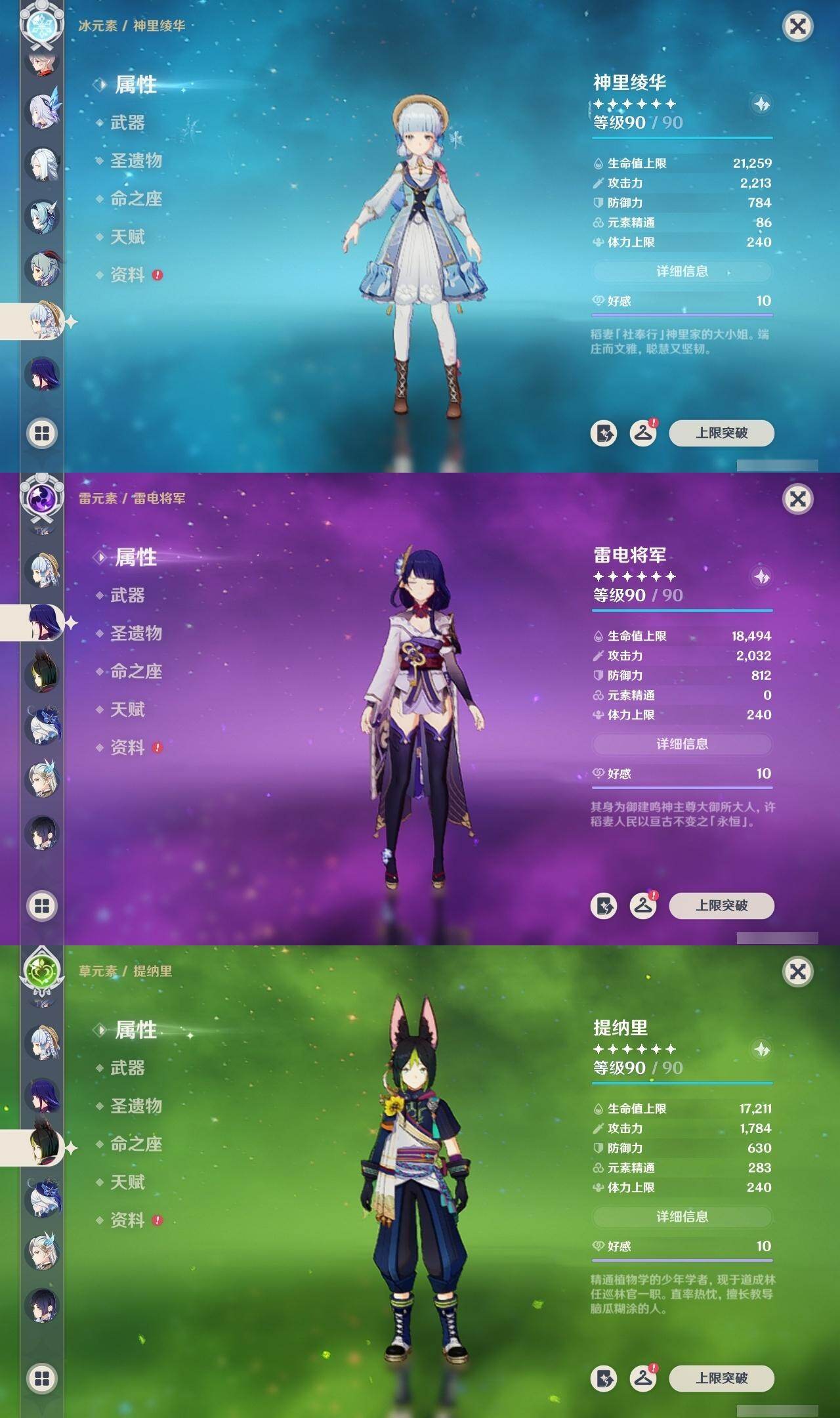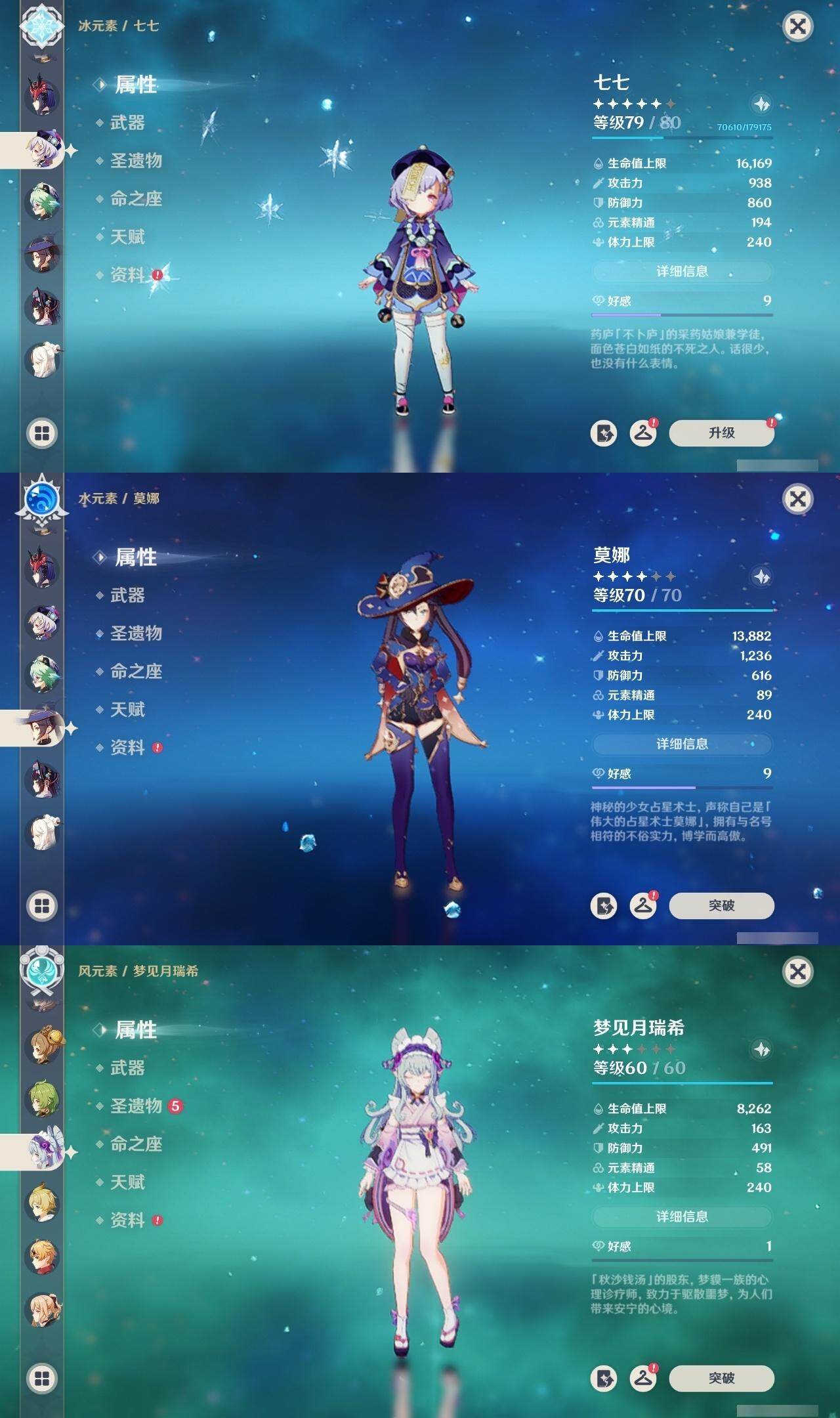 0命阿蕾奇诺,0命闲云,2命芙宁娜,0命莱欧斯利,1命那维莱特,1命迪希雅,0命流浪者,1命纳西妲,0命赛诺,满命提纳里,0命夜兰,0命申鹤,0命优菈,0命雷电将军,0命枫原万叶,0命神里绫华,0命钟离,0命胡桃,0命甘雨,0命魈,0命温迪,0命珊瑚宫心海,2命刻晴,1命七七,4命琴,2命莫娜,2命迪卢克,0命基尼奇,0命希诺宁,1命玛拉妮,0命恰斯卡,0命玛薇卡,0命茜特菈莉,0命梦见月瑞希,0命瓦雷莎,0命丝柯克,精1白雨心弦,精1鹤鸣余音,精1静水流涌之辉,精1万世流涌大典,精2最初的大魔术,精1图莱杜拉的回忆,精2赤沙之杖,精1圣显之钥,精1息灾,精1薙草之稻光,精1雾切之回光,精1苍古自由之誓,精3四风原典,精1和璞鸢,精1天空之翼,精1天空之卷,精1风鹰剑,精1天空之傲,精1冲浪时光,精1祭星者之望,精1苍耀