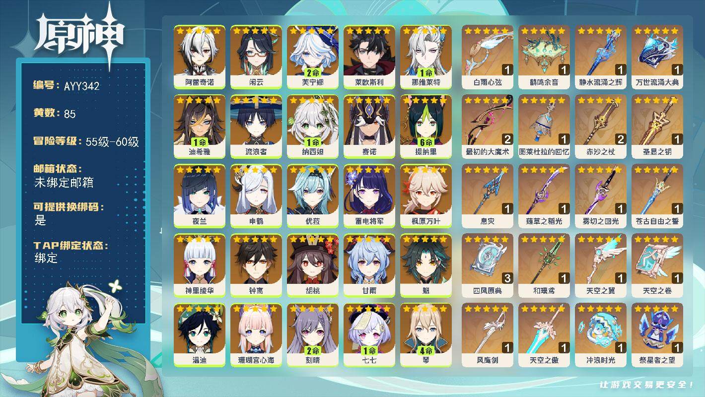 [16324261]60级/85黄/男主/36个五星角色/22个五星武器 0命阿蕾奇诺,0命闲云,2命芙宁娜,0命莱欧斯利,1命那维莱特,1命迪希雅,0命流浪者,1命纳西妲,0命赛诺,满命提纳里,0命夜兰,0命申鹤,0命优菈,0命雷电将军,0命枫原万叶,0命神里绫华,0命钟离,0命胡桃,0命甘雨,0命魈,0命温迪,0命珊瑚宫心海,2命刻晴,1命七七,4命琴,2命莫娜,2命迪卢克,0命基尼奇,0命希诺宁,1命玛拉妮,0命恰斯卡,0命玛薇卡,0命茜特菈莉,0命梦见月瑞希,0命瓦雷莎,0命丝柯克,精1白雨心弦,精1鹤鸣余音,精1静水流涌之辉,精1万世流涌大典,精2最初的大魔术,精1图莱杜拉的回忆,精2赤沙之杖,精1圣显之钥,精1息灾,精1薙草之稻光,精1雾切之回光,精1苍古自由之誓,精3四风原典,精1和璞鸢,精1天空之翼,精1天空之卷,精1风鹰剑,精1天空之傲,精1冲浪时光,精1祭星者之望,精1苍耀