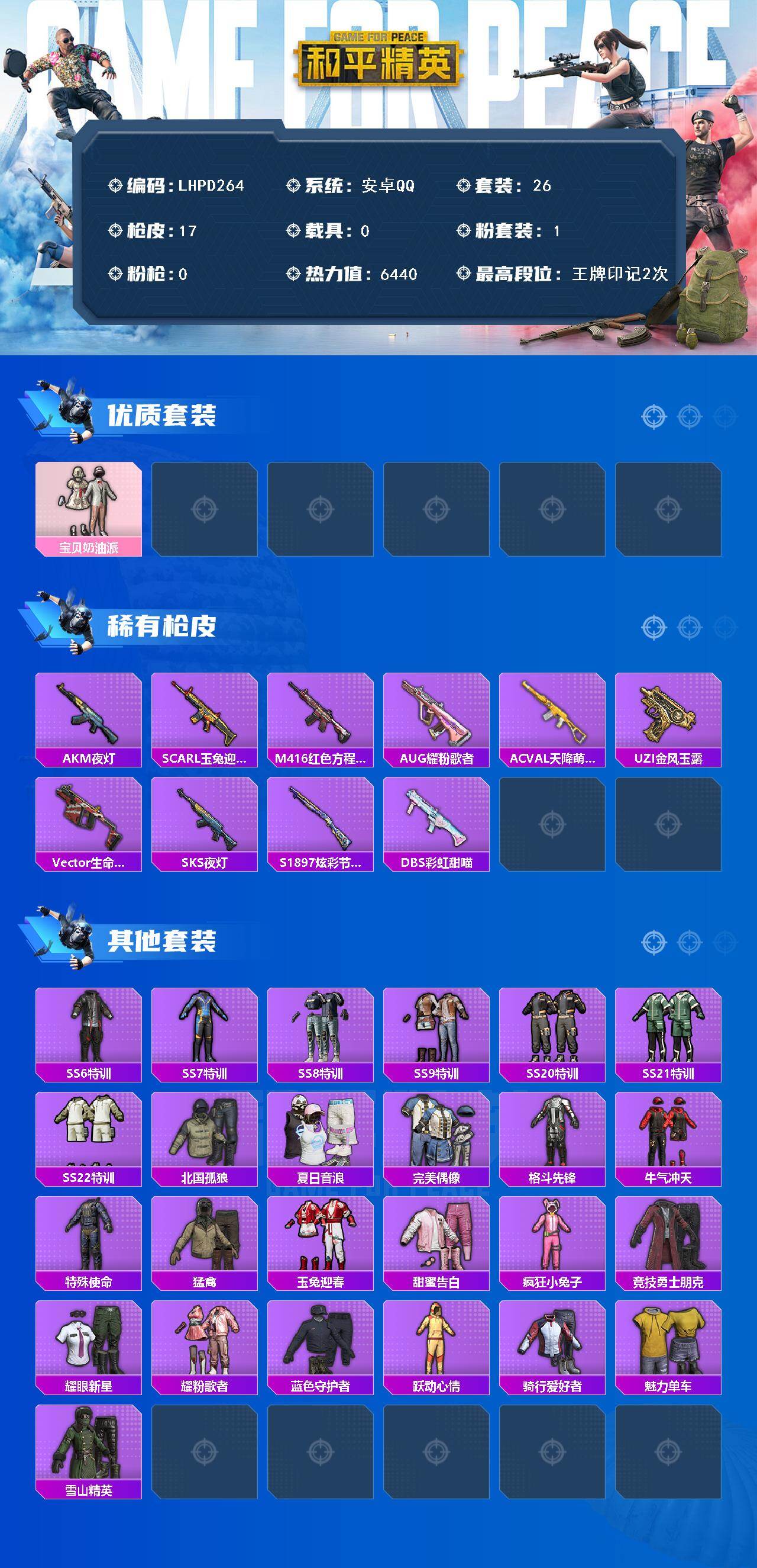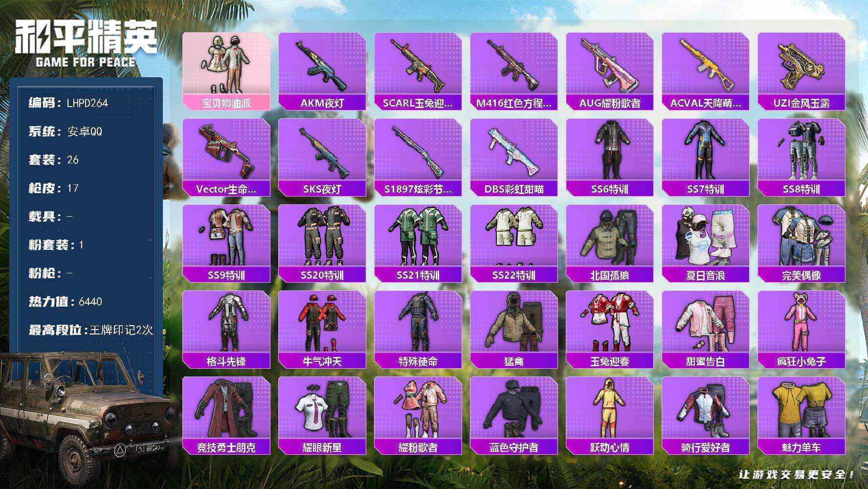 [16324761]【特价出售/店主推荐】安卓 手Q-1粉装-0特效枪-0载具-0粉色飞行器-6440热力值-2王牌印记-26套装-17枪皮【粉色套装】:粉装-宝贝奶油派【稀有枪皮】:AKM-夜灯,SCAR-L-玉兔迎春,M416-红色方程式,AUG-耀粉歌者,AC-VAL-天降萌叽,UZI-金风玉露,Vector-生命誓言,SKS-夜灯,S1897-炫彩节奏,DBS-彩虹甜喵