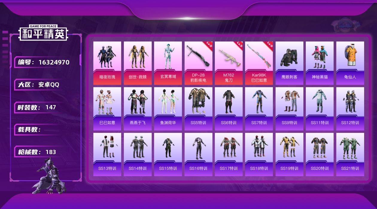 [16324970]【特价出售/店主推荐】安卓 手Q-3粉装-3特效枪-0载具-1粉色飞行器-55536热力值-7王牌印记-147套装-183枪皮【热门品类】:套装-龟仙人【粉色套装】:粉装-暗夜玫瑰,套装-创世·救赎,角色-玄冥寒域【粉色枪皮等级】:M762-鬼刀(五级),Kar98K-巳巳如意(五级),DP-28-豹影疾电(五级)【粉色枪皮】:M762-鬼刀,Kar98K-巳巳如意,DP-28-豹影疾电【粉色飞行器】:繁龙极客飞行器