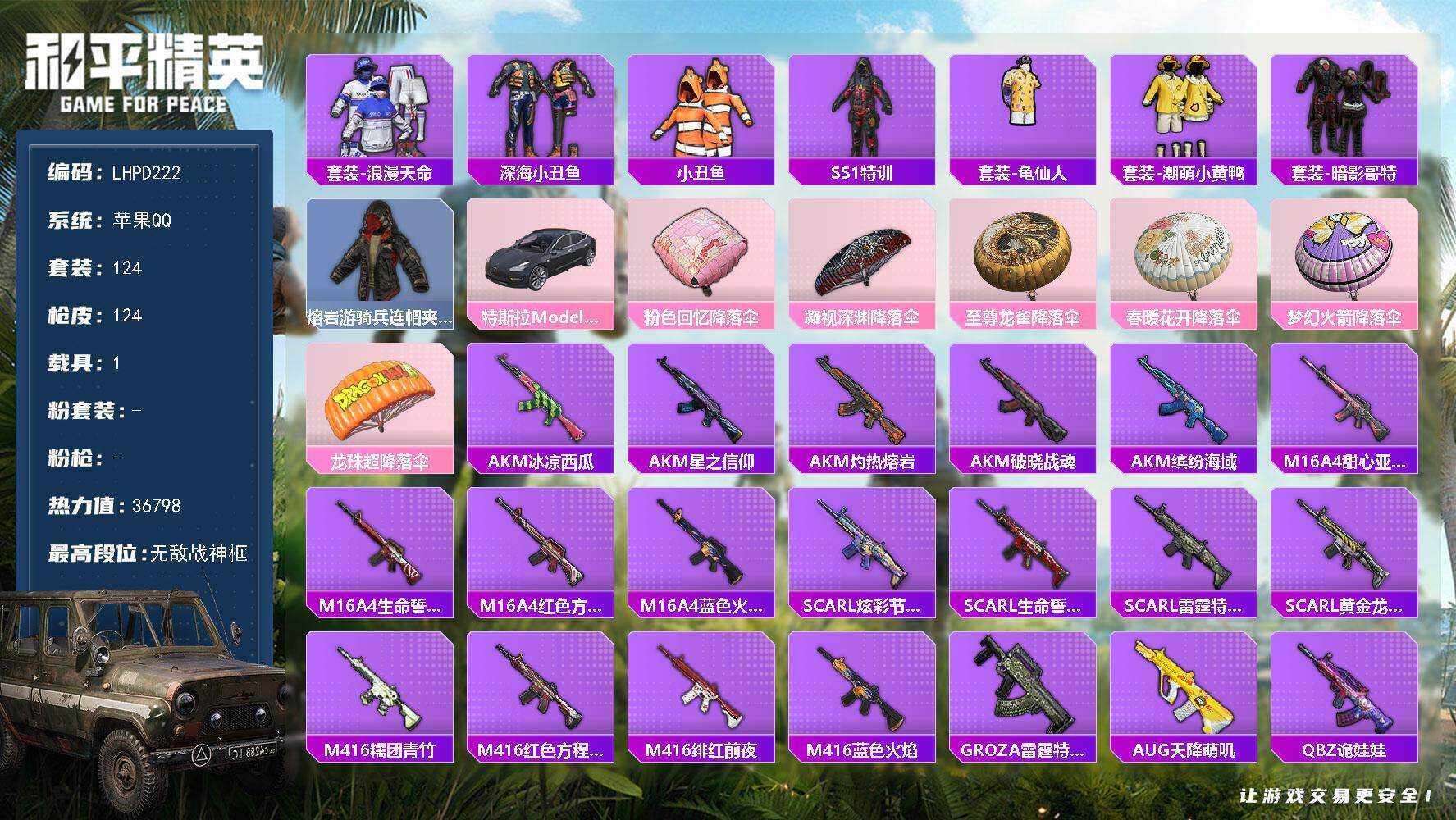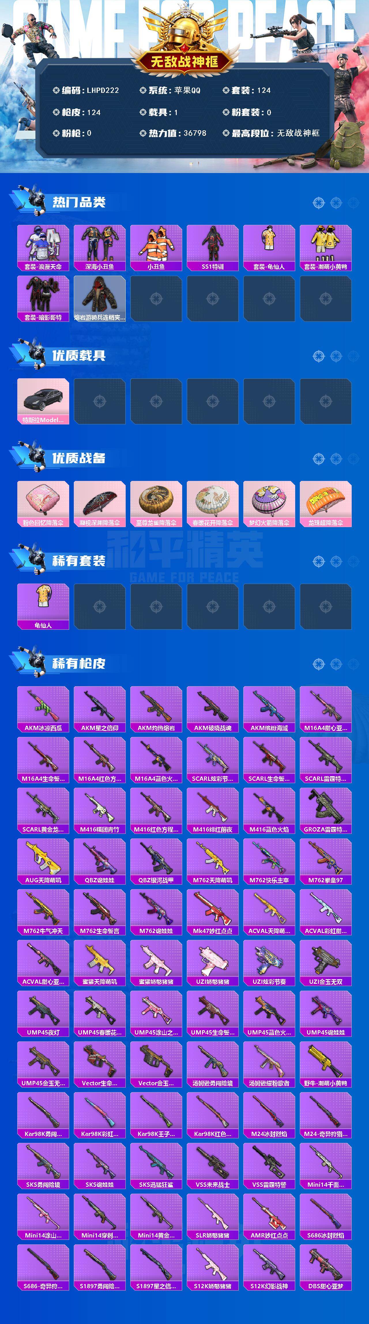 [16325268]【特价出售/苹果 手Q-无敌战神框-0粉装-0特效枪-1载具-0粉色飞行器-36798热力值-9王牌印记-124套装-124枪皮【热门品类】:套装-浪漫天命,套装-深海小丑鱼,套装-小丑鱼,套装-SS1特训,套装-龟仙人,套装-潮萌小黄鸭,套装-暗影哥特,熔岩游骑兵连帽夹克【粉色载具】:特斯拉Model 3(冷光银)
