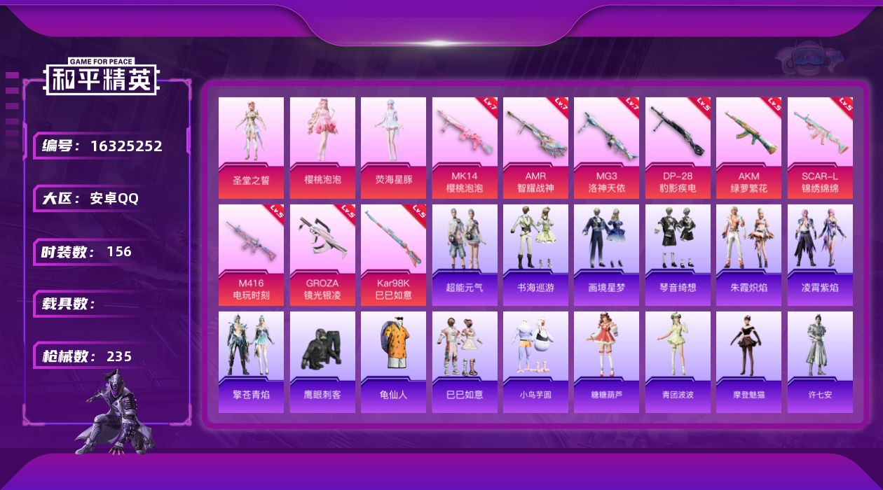 [16325252]【特价出售/店主推荐】安卓 手Q-3粉装-9特效枪-0载具-1粉色飞行器-65080热力值-9王牌印记-156套装-235枪皮【热门品类】:套装-龟仙人【粉色套装】:角色-圣堂之誓,角色-樱桃泡泡,角色-荧海星豚【粉色枪皮等级】:AKM-绿萝繁花(五级),SCAR-L-锦绣绵绵(五级),M416-电玩时刻(五级),GROZA-镜光银凌(五级),Kar98K-巳巳如意(五级),Mk14-樱桃泡泡(七级),AMR-智耀战神(七级),DP-28-豹影疾电(五级),MG3-洛神天依(七级)【粉色枪皮】:AKM-绿萝繁花,SCAR-L-锦绣绵绵,M416-电玩时刻,GROZA-镜光银凌,Kar98K-巳巳如意,Mk14-樱桃泡泡,AMR-智耀战神,DP-28-豹影疾电,MG3-洛神天依