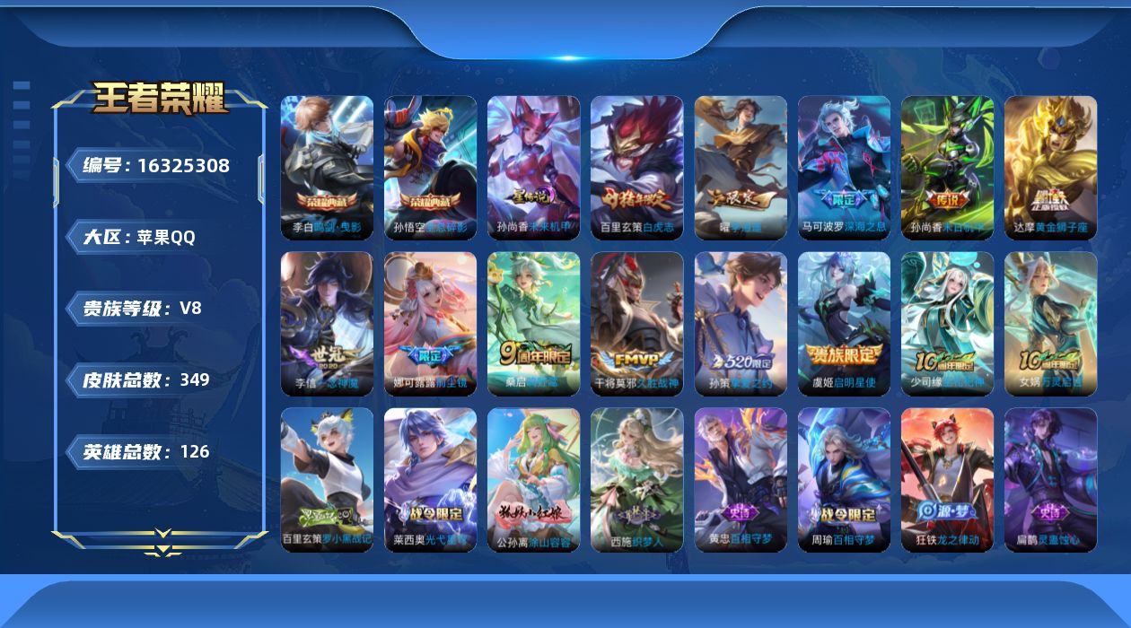 [16325308]苹果Q-349皮肤-2典藏皮肤-12传说-87史诗 【英雄全皮】:孙权全皮,钟馗全皮 【荣耀典藏】:孙悟空全息碎影,李白鸣剑曳影 【传说皮肤】:后羿神树通天,桑启鸣野蒿,娜可露露前尘镜,马可波罗深海之息,孙策挚爱之约,曜李逍遥 ,虞姬启明星使,李信一念神魔,干将莫邪久胜战神,达摩黄金狮子座,百里玄策白虎志,孙尚香末日机甲 【限定皮肤】:白起狰,虞姬夏日便利店,姜子牙天穹之誓,狄仁杰阴阳师,虞姬凯尔特女王,赵云皇家上将,妲己时之奇旅,嬴政白昼王子,孙尚香蔷薇恋人,鲁班七号狮舞东方,庄周蜃楼王,高渐离死亡摇滚,孙膑妖精王,扁鹊炼金王,芈月重明,吕布猎兽之王,元歌云间偶戏,夏侯惇朔风刀,曹操烛龙,典韦穷奇,典韦蓝屏警告,马可波罗逐梦之星,马可波罗深海之息,狄仁杰魔术师,狄仁杰万华元夜,达摩星际陆战队,达摩沙漠行僧,项羽海滩派对,老夫子醍醐杖,关羽冰锋战神,程咬金演武夺筹,露娜一生所爱,韩信飞衡,兰陵王金庭之子,花木兰青春决赛季,花木兰瑞麟志,娜可露露前尘镜,亚瑟潮玩骑士王,孙悟空美猴王,牛魔御旌,后羿圣弓游侠,李元芳云中旅人,虞姬霸王别姬,虞姬启明星使,钟馗神迹守卫,钟馗驱傩正仪,杨玉环遇见飞天,女娲朔望之晖,干将莫邪真爱魔法,雅典娜单词大作战,雅典娜黎明之约,蔡文姬繁星吟游,太乙真人饕餮,太乙真人华丽摇滚,鬼谷子原初探秘者,鬼谷子五谷丰年,苏烈千军破阵,百里玄策白虎志,百里玄策原初追逐者,弈星混沌棋,梦奇顽趣,沈梦溪大漠名商,明世隐疑决卦,裴擒虎李小龙,裴擒虎擒涛扼浪,狂铁御狮,米莱狄御霄,米莱狄胡桃异想国,盾山御銮,孙策挚爱之约,上官婉儿梁祝,上官婉儿神器万象笔,嫦娥拒霜思,曜李逍遥 ,蒙犽狂想玩偶喵,镜匿光追影者,桑启海盐诗旅,艾琳女武神,艾琳流音漫舞,张良古海寻踪,蒙恬荣光圣徽,鬼谷子天穹祈灯,沈梦溪龙舞盛年,刘邦剑破天穹,周瑜熔金海岸 【年限皮肤】:百里玄策白虎志,花木兰瑞麟志,孙悟空美猴王,韩信飞衡 【赛季限定】:庄周蜃楼王,孙膑妖精王,扁鹊炼金王,白起狰,芈月重明,夏侯惇朔风刀,曹操烛龙,典韦穷奇,狄仁杰万华元夜,达摩沙漠行僧,老夫子醍醐杖,程咬金演武夺筹,兰陵王金庭之子,张良古海寻踪,牛魔御旌,李元芳云中旅人,虞姬凯尔特女王,钟馗驱傩正仪,雅典娜黎明之约,太乙真人饕餮,鬼谷子原初探秘者,苏烈千军破阵,百里玄策原初追逐者,弈星混沌棋,梦奇顽趣,沈梦溪大漠名