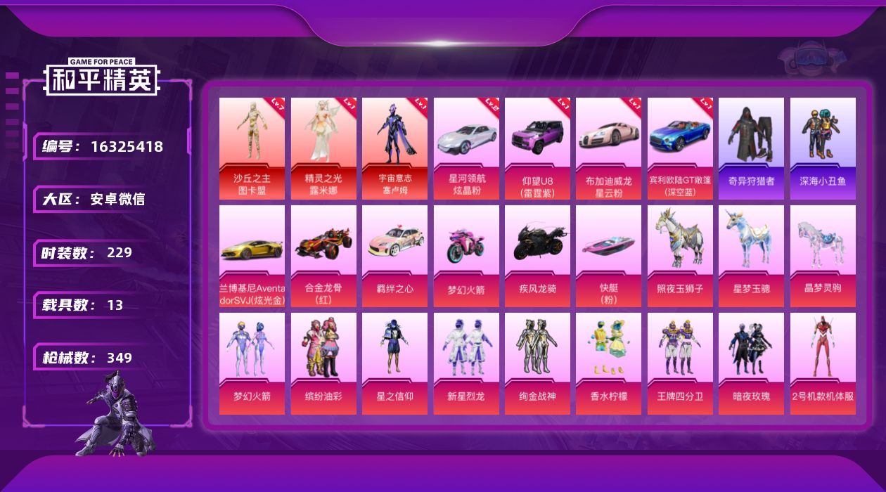 [16325418]满级图卡盟3红装随意切换/满级墨龙九天/4红车布加迪宾利仰望/U8星河领航安卓 微信-3神装-23粉装-27特效枪-13载具-11粉色飞行器-181594热力值-24王牌印记-229套装-349枪皮 【红色载具】:宾利欧陆GT敞篷(深空蓝)(一级),布加迪威龙(星云粉)(一级),仰望U8(雷霆紫)(一级),星河领航(炫晶粉)(二级) 【红色神装等级】:精灵之光-露米娜(一级),宇宙意志-塞卢姆(一级),沙丘之主-图卡盟(七级) 【红色角色神装】:精灵之光-露米娜,宇宙意志-塞卢姆,沙丘之主-图卡盟 【热门品类】:粉装-梦幻火箭,粉装-缤纷油彩,套装-深海小丑鱼,套装-奇异狩猎者,角色-忠猛周仓,角色-忠真马岱,套装-龟仙人,套装-暗影哥特,套装-粉红小猪,角色-8号机,角色-Mark.06,大砍刀-青龙偃月刀,撬棍-龙胆亮银枪 【粉色载具】:兰博基尼Aventador SVJ(炫光金),宾利欧陆GT敞篷(深空蓝),仰望U8(雷霆紫),布加迪威龙(星云粉),星河领航(炫晶粉),合金龙骨(红),羁绊之心,双人摩托-梦幻火箭,疾风龙骑,空客H135-蔚蓝之翼,快艇-塞莎KL27(霓虹粉),照夜玉狮子,星梦玉骢,晶梦灵驹 【粉色套装】:粉装-梦幻火箭,粉装-星之信仰,粉装-缤纷油彩,粉装-新星烈龙,粉装-绚金战神,粉装-香水柠檬,粉装-王牌四分卫,粉装-暗夜玫瑰,角色-2号机款机体服,粉装-青葱仙萝,粉装-金风银杏,粉装-暗星紫秘,粉装-天之羽翼,粉装-碧影闪光,粉装-岚岚物语,粉装-薄荷物语,粉装-橘柚倾心,粉装-炙焰牛王,粉装-暗夜鎏金,角色-烟云彩露,粉装-金丰海韵,角色-千金淑猫,角色-女娲灵识 【粉色枪皮等级】:AKM-梦之光华(五级),SCAR-L-机甲封神(五级),SCAR-L-青春物语(一级),M416-心之恋语(二级),M416-风花雪月(一级),M416-墨龙九天(九级),GROZA-香水柠檬(四级),GROZA-精灵之光(三级),AUG-妙趣可丽(四级),M762-甜蜜誓约(五级),UMP45-相思残雪(七级),Vector-灵感创作师(四级),汤姆逊-怪笑疯兔(二级),P90-沙丘之主(一级),Kar98K-伏魔团(三级),Kar98K-巳巳如意(五级),M24-星之信仰(五级),M24-暗星紫秘(一级),AWM-橘柚倾心(二级),SLR-暗夜玫瑰