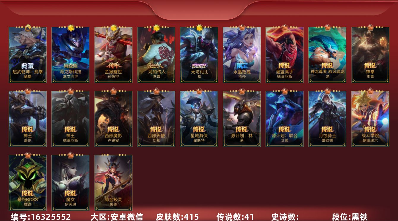 [16325552]社交限制介意勿拍!安卓-有二次-6.9w收藏!415皮肤1典藏5神话41传说!水晶玫瑰喜宴!水晶花路拖尾!紫龙回城! 神话:蝶恋春 金猴耀世 海克斯嘉文四世 无与伦比 龙的传人 收集:水晶玫瑰喜宴 战斗学院启程 玉兔呈祥,超武乾坤:孤拳 瑟提,海克斯科技 嘉文四世,龙的传人 李青,源计划:林 易,最终BOSS 维迦,神拳 李青,神王 德莱厄斯,灌篮高手 德莱厄斯,神王 盖伦,战斗学院 伊泽瑞尔,源计划:联合 艾希,西部天使 艾希,神龙尊者 驭风啸龙 易,月蚀骑士 蕾欧娜,魔女 伊芙琳,水晶玫瑰 卡莎,星域游侠 崔斯特,西部魔影 卢锡安,S18冠翎巨神像,s16冠翎飞行员,s14龙冕神策,s10王牌上将,s13龙冕御盾,s12龙冕先锋,s11王牌司令,S11王牌勇将,s8绯金鮫灵