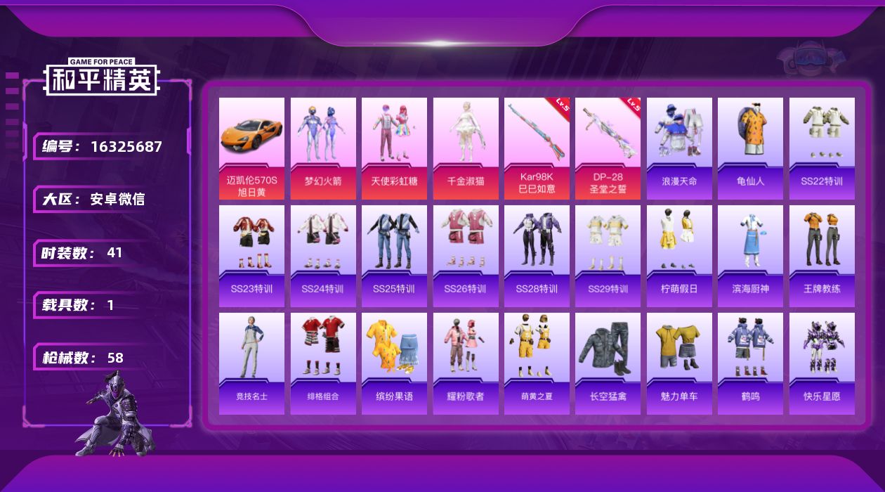 [16325687]【特价出售/店主推荐】安卓 微信-3粉装-2特效枪-1载具-1粉色飞行器-17562热力值-3王牌印记-41套装-58枪皮【热门品类】:粉装-梦幻火箭,套装-浪漫天命,套装-龟仙人【粉色套装】:粉装-天使彩虹糖,粉装-梦幻火箭,角色-千金淑猫【粉色枪皮等级】:Kar98K-巳巳如意(五级),DP-28-圣堂之誓(五级)【粉色载具】:迈凯伦570S(旭日黄)【粉色枪皮】:Kar98K-巳巳如意,DP-28-圣堂之誓【粉色飞行器】:月下星之子飞行器