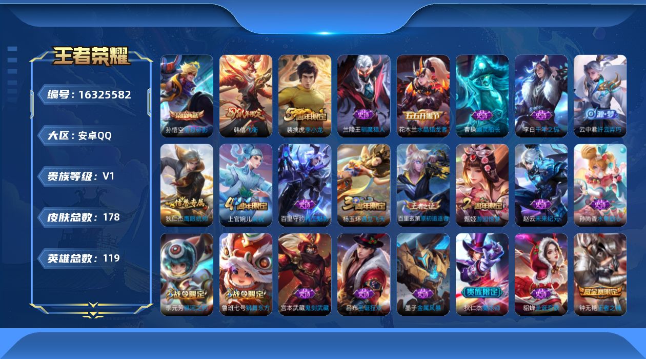 [16325582]安卓Q-V7-秩序白银II段位-118英雄-178皮肤-1典藏-0珍品无双-0无双-0珍品传说-0传说-26史诗