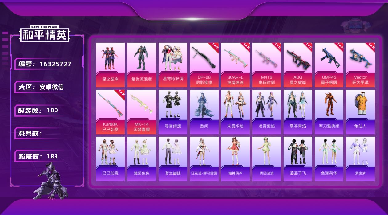 [16325727]【特价出售/店主推荐】安卓 微信-3粉装-8特效枪-0载具-2粉色飞行器-48847热力值-10王牌印记-100套装-183枪皮【热门品类】:角色-军刀雅典娜,套装-龟仙人【粉色套装】:粉装-星之彼岸,角色-复仇流浪者,粉装-星穹咏叹调【粉色枪皮等级】:SCAR-L-锦绣绵绵(五级),M416-电玩时刻(五级),AUG-星之彼岸(五级),UMP45-量子极限(五级),Vector-环太平洋(五级),Kar98K-巳巳如意(五级),DP-28-豹影疾电(五级)【粉色枪皮】:SCAR-L-锦绣绵绵,M416-电玩时刻,AUG-星之彼岸,UMP45-量子极限,Vector-环太平洋,Kar98K-巳巳如意,Mk14-闲梦青缨,DP-28-豹影疾电【粉色飞行器】:星之彼岸飞行器