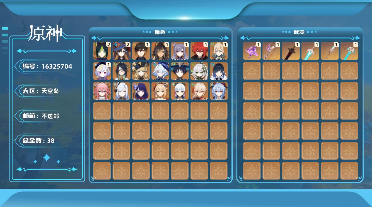 0命闲云,0命娜维娅,0命芙宁娜,1命迪希雅,0命流浪者,0命纳西妲,2命提纳里,0命夜兰,0命八重神子,0命申鹤,0命雷电将军,0命枫原万叶,0命神里绫华,1命钟离,0命甘雨,0命宵宫,1命刻晴,1命七七,1命琴,2命莫娜,1命迪卢克,0命菲林斯,精1神乐之真意,精1飞雷之弦振,精1天空之脊,精1天空之刃,精1狼的末路,精1天空之傲