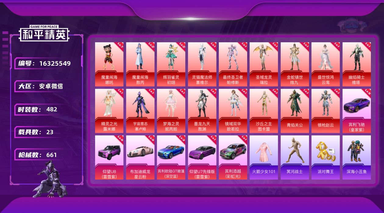 [16325549]40w热力-老101-全素材-安卓-无敌战神框-17神装-88粉装-72特效枪-23载具-45粉色飞行器-24王牌印记-482套装-661枪皮 【红色载具】:宾利添越(彩虹光)(一级),宾利飞驰(皇家紫)(五级),宾利欧陆GT敞篷(深空蓝)(三级),布加迪威龙(星云粉)(四级),仰望U8(雷霆紫)(四级),仰望U7(雷霆紫)(一级) 【红色神装等级】:魔童闹海-敖丙(二级),魔童闹海-哪吒(七级),灵猫魔法师-塞维尔(一级),最终圣卫者-帕修斯(一级),辉羽雀灵-初翊(二级),圣域龙灵-瑞拉(一级),金蛇镇世-烛九(一级),盛世惊鸿-云鸾(一级),幽焰骑士-维塔(一级),精灵之光-露米娜(一级),宇宙意志-塞卢姆(一级),梦海之灵-妮芮妲(一级),墨龙九天-敖渊(一级),镜域双华-欧若拉(一级),沙丘之主-图卡盟(一级),角色-青焰关公(一级),角色-银枪赵云(一级) 【红色角色神装】:魔童闹海-敖丙,魔童闹海-哪吒,灵猫魔法师-塞维尔,最终圣卫者-帕修斯,辉羽雀灵-初翊,圣域龙灵-瑞拉,金蛇镇世-烛九,盛世惊鸿-云鸾,幽焰骑士-维塔,精灵之光-露米娜,宇宙意志-塞卢姆,梦海之灵-妮芮妲,墨龙九天-敖渊,镜域双华-欧若拉,沙丘之主-图卡盟,角色-青焰关公,角色-银枪赵云 【热门品类】:粉装-雪国幻梦,粉装-梦幻火箭,粉装-繁龙极客,套装-火箭少女101,套装-冥河战士,套装-派对舞王,套装-深海小丑鱼,套装-小丑鱼,角色-军刀雅典娜,套装-暗夜行者,套装-浪客战士,角色-2B战斗服款,角色-忠猛周仓,角色-忠真马岱,角色-忠义严颜,套装-六号树人,套装-龟仙人,套装-潮萌小黄鸭,套装-暗影哥特,套装-粉红小猪,角色-8号机,角色-Mark.06,大砍刀-青龙偃月刀,撬棍-龙胆亮银枪 【粉色载具】:玛莎拉蒂Ghibli(金),宾利欧陆GT敞篷(深空蓝),宾利飞驰(皇家紫),宾利添越(彩虹光),仰望U9(赤霞丹朱),仰望U7(雷霆紫),仰望U8(雷霆紫),布加迪威龙(星云粉),帕加尼imola(艺术银),星河领航(磐石银),合金龙骨(红),糖心拉力赛车(波动紫),双人摩托-梦幻火箭,布尔玛摩托车,疾风龙骑,鬼马风驰,僚机-萌兔起飞,快艇-自由的鲸,赤兔,照夜玉狮子,星梦玉骢,护世瑞兽,冰绡玉鳞,辉羽雀灵自行车 【粉色套装】:粉装-甜心巧克力,粉装-宝贝奶油派,粉装-天
