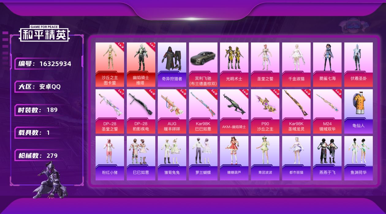 [16325934]1级维塔!2级图卡盟!安卓 手Q-2神装-5粉装-8特效枪-1载具-10粉色飞行器-97454热力值-23王牌印记-189套装-279枪皮