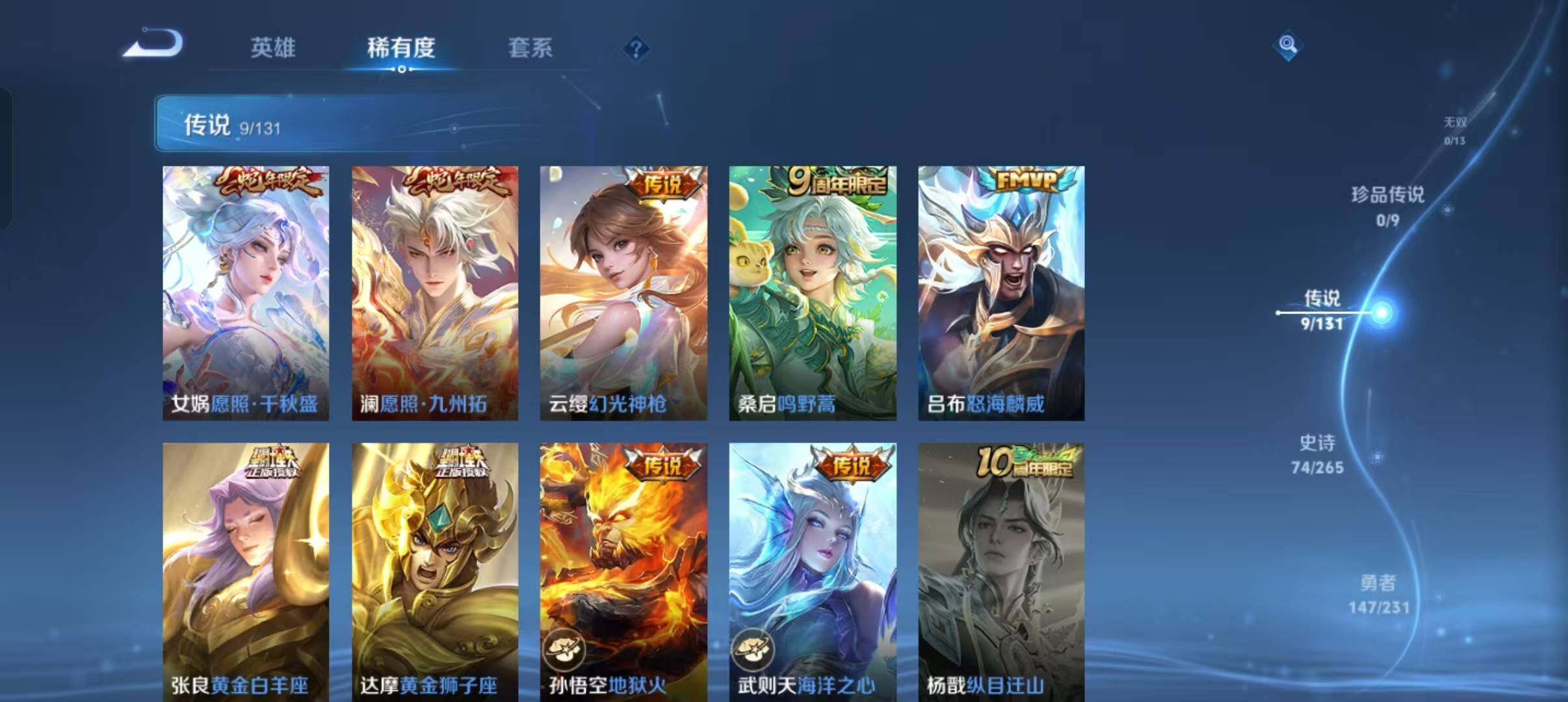 【传说皮肤】:女娲愿照千秋盛,澜愿照九州拓,云缨幻光神枪,桑启鸣野蒿,吕布怒海麟威,张良黄金白羊座,达摩黄金狮子座,孙悟空地狱火,武则天海洋之心