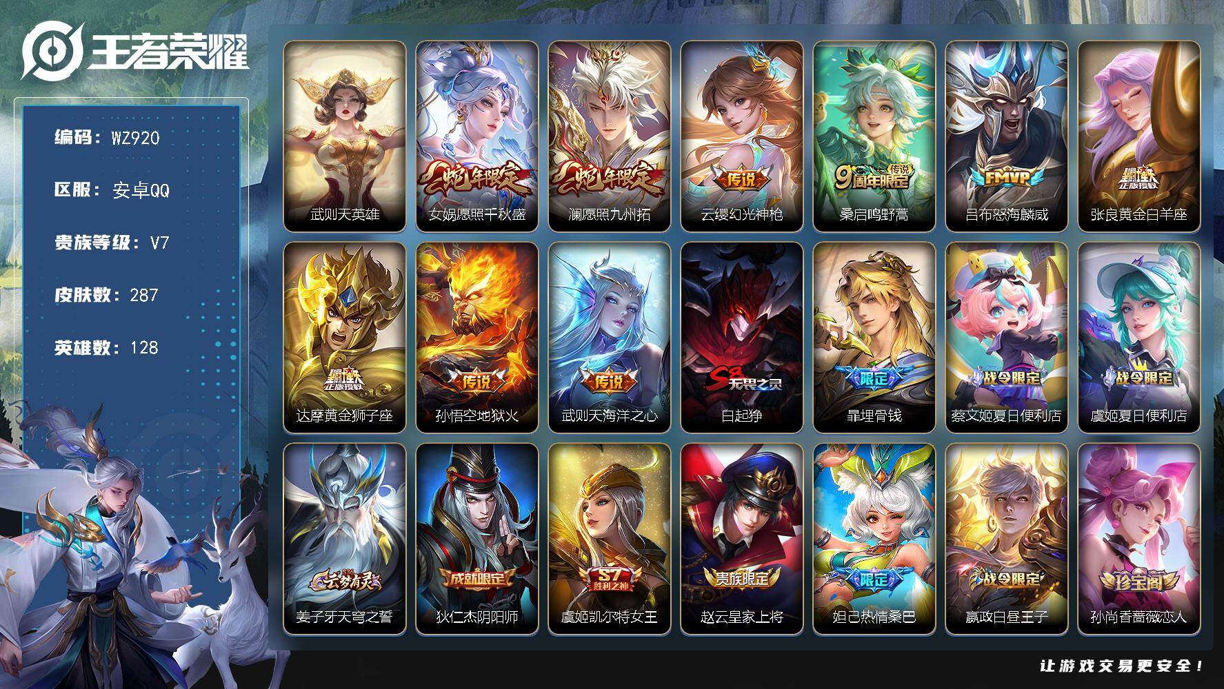 [16325938]安卓Q-V7-最强王者段位-128英雄-287皮肤-1典藏英雄-9传说-74史诗
