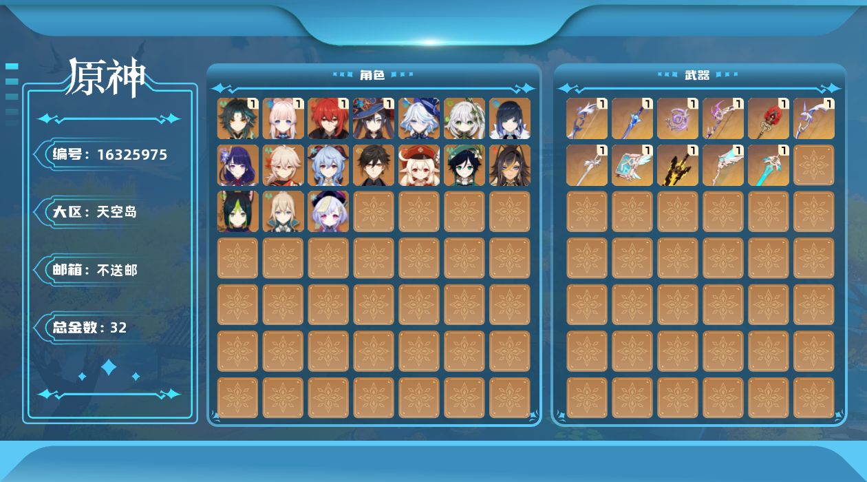0命芙宁娜,0命迪希雅,0命纳西妲,0命提纳里,0命夜兰,0命雷电将军,0命枫原万叶,0命钟离,0命甘雨,1命魈,0命温迪,0命可莉,1命珊瑚宫心海,0命七七,0命琴,1命莫娜,1命迪卢克,精1若水,精1波乱月白经津,精1不灭月华,精1飞雷之弦振,精1无工之剑,精1护摩之杖,精1天空之翼,精1阿莫斯之弓,精1天空之刃,精1天空之卷,精1风鹰剑