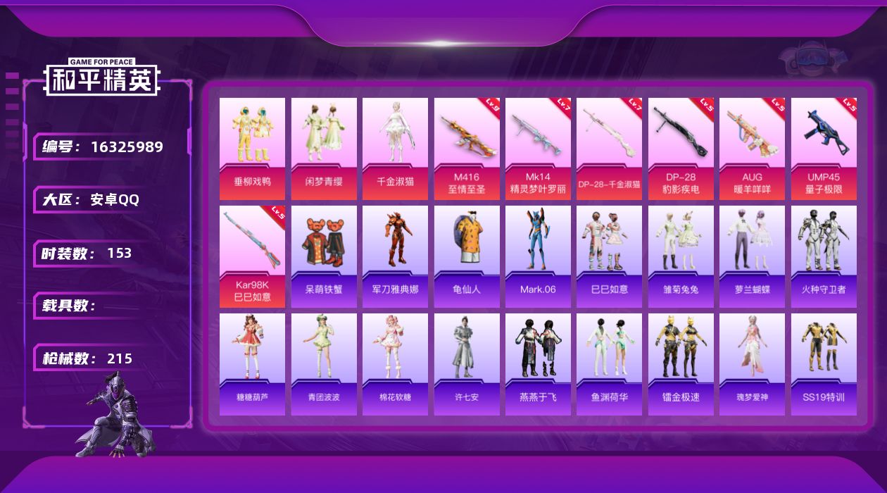 - [14072475]【1581】安卓 手Q-0粉装-2特效枪-0载具-0粉色飞行器-15405热力值-2王牌印记-32套装-68枪皮 【粉色枪皮等级】:Kar98K-巳巳如意(五级),DP-28-豹影疾电(五级) 【粉色枪皮】:Kar98K-巳巳如意,DP-28-豹影疾电 【粉色降落伞】:绯穹魔姬降落伞,喜羊羊与灰太狼降落伞,异瞳寒姬降落伞 【稀有套装】:套装-暗械蛇影,套装-巳巳如意,套装-糖糖葫芦,套装-青团波波,角色-俏兔智灵,套装-燕燕于飞,套装-鱼渊荷华,套装-蓝海鲸歌,角色-紫俏灵猫 【稀有枪皮】:AKM-破晓战魂,M16A4-千金淑猫,SCAR-L-红色方程式,M416-红色方程式,M416-蓝色火焰,AUG-甜蜜菠萝,AUG-耀粉歌者,M762-天降萌叽,G36C-星穹咏叹调,UMP45-夜灯,UMP45-绒宝小鹅,汤姆逊-天降萌叽,P90-巳巳如意,Mini14-镭金极速,AMR-喜羊羊与灰太狼,S686-巳巳如意,S12K-夜灯,MG3-幻世战舞者,爆炸猎弓-喜羊羊与灰太狼,破片手榴弹-巳巳如意 【其他套装】:套装-光之冒险,套装-暗黑骑手,套装-海岛探路者,套装-猎鹰,套装-黄色运动,角色-白光莹 【营地ID】:1016010307