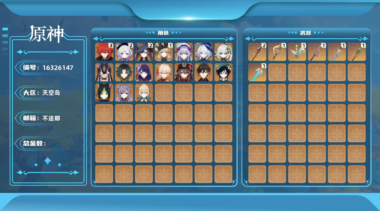 [16326147]【金色角色】:梦见月瑞希(0命),娜维娅(1命),芙宁娜(0命),纳西妲(0命),赛诺(0命),提纳里(0命),雷电将军(0命),枫原万叶(0命),胡桃(0命),魈(0命),钟离(0命),温迪(0命),琴(0命),刻晴(0命),迪卢克(3命),莫娜(2命),七七(2命) 【拥有武器】:裁断(精1),千夜浮梦(精1),薙草之稻光(精1),苍古自由之誓(精1),贯虹之槊(精2),和璞鸢(精1),天空之刃(精1) 【紫色角色】:雅珂达(0命),爱诺(0命),塔利雅(0命),伊法(2命),欧洛伦(0命),卡齐娜(1命),夏洛蒂(1命),琳妮特(0命),卡维(0命),米卡(0命),瑶瑶(1命),珐露珊(1命),莱依拉(0命),坎蒂丝(3命),多莉(0命),柯莱(4命),鹿野院平藏(2命),久岐忍(0命),云堇(0命),五郎(3命),托马(3命),九条裟罗(4命),早柚(4命),烟绯(4命),罗莎莉亚(满命),辛焱(满命),迪奥娜(满命),砂糖(3命),雷泽(4命),菲谢尔(0命),丽莎(1命),北斗(3命),香菱(满命),安柏(1命),班尼特(满命),行秋(满命),芭芭拉(满命),凝光(满命),诺艾尔(满命),凯亚(0命),重云(3命)