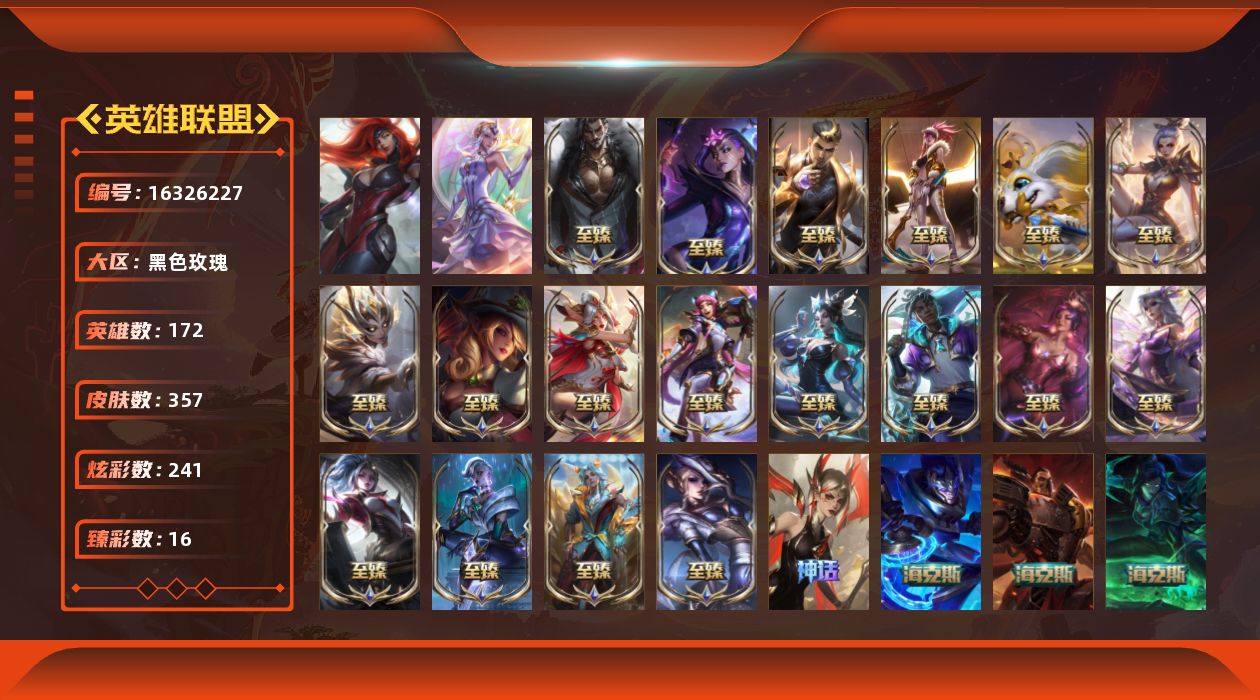 黄金段位-172英雄-357皮肤-241炫彩-2终极-26神话-54限定-42传说-48史诗