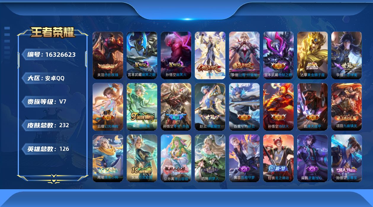 [16326623]安卓Q-V7-至尊星耀V段位-126英雄-231皮肤-1典藏皮肤-12传说-57史诗