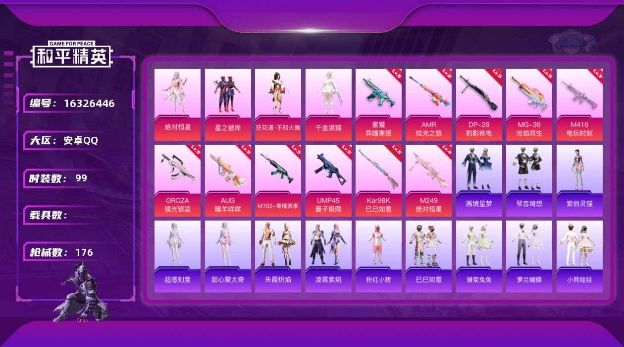 [16326446]【特价出售/店主推荐】安卓 手Q-4粉装-11特效枪-0载具-1粉色飞行器-51421热力值-7王牌印记-99套装-176枪皮【热门品类】:套装-粉红小猪【粉色套装】:角色-绝对恒星,粉装-星之彼岸,角色-狂花道·不知火舞,角色-千金淑猫【粉色枪皮等级】:M416-电玩时刻(五级),GROZA-镜光银凌(五级),AUG-暖羊咩咩(五级),M762-青锋波束(五级),蜜獾-异瞳寒姬(六级),UMP45-量子极限(五级),Kar98K-巳巳如意(五级),AMR-炫光之旅(六级),M249-绝对恒星(四级),DP-28-豹影疾电(五级),MG-36-沧焰双生(五级)【粉色枪皮】:M416-电玩时刻,GROZA-镜光银凌,AUG-暖羊咩咩,M762-青锋波束,蜜獾-异瞳寒姬,UMP45-量子极限,Kar98K-巳巳如意,AMR-炫光之旅,M249-绝对恒星,DP-28-豹影电,MG-36-沧焰双生【粉色飞行器】:绝对恒星飞行器