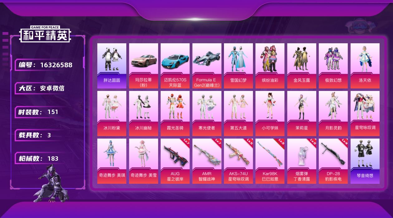 [16326588]雪国猪妹洛天依暗影哥特 2把7级枪 安卓 微信-16粉装-6特效枪-3载具-3粉色飞行器-67581热力值-12王牌印记-151套装-183枪皮