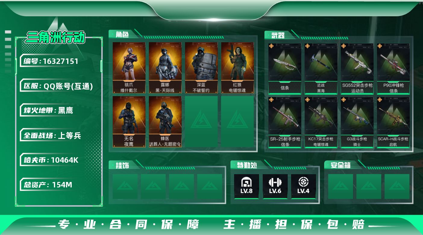 [16327151]【店主推荐捡漏号!可直接换绑】10464k哈伏币-136m流动资产-60烽火等级-黑鹰-27战场等级-上等兵 【干员外观】:露娜-黑·天际线,骇爪-维什戴尔,蜂医-送葬人·无题密令,无名-夜鹰,深蓝-不破誓约,红狼-电锯惊魂 【近战皮肤】:近战-黑海,近战-信条,近战-黑鹰 【传说外观】:M4A1突击步枪-阿米娅,SG552突击步枪-运动员,AK-12突击步枪-夜鹰,AK-12突击步枪-特斯拉线圈,SCAR-H战斗步枪-启航,G3战斗步枪-骑士,AS Val突击步枪-蛇年祥瑞,腾龙突击步枪-捞点薯条,KC17突击步枪-电锯惊魂,MP5冲锋枪-黑海,P90冲锋枪-信条,UZI冲锋枪-特斯拉线圈,SMG-45冲锋枪-骑士,SR-3M紧凑突击步枪-特斯拉线圈,勇士冲锋枪-能天使-午夜邮差,725双管霰弹枪-送葬人-无题密令,M250通用机枪-骑士之心,QJB201轻机枪-黑海,SR-25射手步枪-水墨云图,SR-25射手步枪-信条,R93狙击步枪-维什戴尔,AWM狙击步枪-捞点薯条,93R-捞点薯条,复合弓-黑·天际线 【史诗外观】:AKM突击步枪-林中猎手,QBZ95-1突击步枪-曙光,ASh-12战斗步枪-守夜人,ASh-12战斗步枪-无极限,M16A4突击步枪-竞赛选手,AUG突击步枪-蝮蛇,M7战斗步枪-禁卫,SG552突击步枪-尖端治疗,SG552突击步枪-深海恐惧,SCAR-H战斗步枪-囚徒,G3战斗步枪-战场英杰,G3战斗步枪-流沙送葬,AS Val突击步枪-尖端治疗,AS Val突击步枪-典狱官,AS Val突击步枪-百步穿杨,腾龙突击步枪-无垢,腾龙突击步枪-猎鳄行动,K437突击步枪-守护者,MP5冲锋枪-深海恐惧,MP5冲锋枪-战术竞备,MP5冲锋枪-竞技风,Vector冲锋枪-阿萨拉文明,Vector冲锋枪-猎鳄行动,Vector冲锋枪-异域战争,SR-3M紧凑突击步枪-英雄,SR-3M紧凑突击步枪-荒野求生,SR-3M紧凑突击步枪-战术竞备,勇士冲锋枪-深海恐惧,勇士冲锋枪-工业狂潮,MP7冲锋枪-无垢,MP7冲锋枪-守护者,QCQ171冲锋枪-禁卫,M1014霰弹枪-林中猎手,S12K霰弹枪-曙光,PKM通用机枪-蝮蛇,PKM通用机枪-守夜人,PKM通用机枪-荒野求生,M250通用机枪-囚徒,Mini-14射手步枪-守护者,SVD狙击步枪-阿