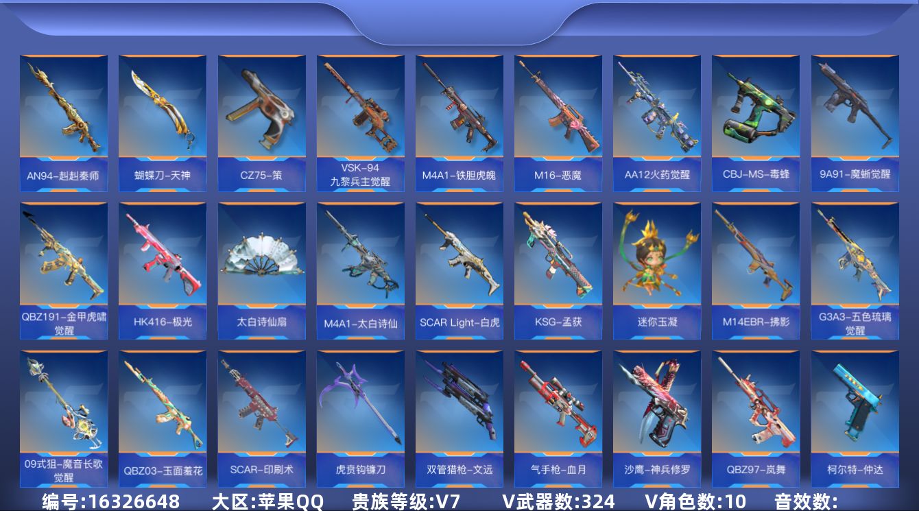 [16326648]10英雄角色数-314英雄武器数 【王者系列】:王者之影,王者之心,王者之迹,王者之蝶,王者之兽,王者之狱,王者之魂,王者之霆,王者之业,王者之誉 【热门武器】:KSG-孟获,81式-光明之神,M4A1-仲达,AK47-常胜,M4A1-星象,AK47-游骑兵,M4A1-游骑兵,TAC-慈,M200-幻神,AWM-游骑兵,VEPR12-宙斯,COP 357-赤龙,黄金COP 357,COP 357-A,COP 357-绚樱*4,CZS2-仲康,AN94-盖 【角色】:幽灵刀锋-觉醒,樱,瞳,关小雨,职场灵狐-赛事经理,零-水下丽影,炽天使-X,零-新生,步练师,罗峰&巴巴塔-X 【英雄武器】:AK47-无影,AK47-火麒麟,AK47-麒麟,AK47-角斗士,AK47-耀金伯爵,AK47-游骑兵,AK47-常胜,AK47-樱斗士-二觉,AK47-竞技战魂,AK47-猩红传说,AK47-燎天净火,AK47-雷麒麟,AK47-心动次元,AK47-血武士,AK47-华夏传说,AK47-黑鲨,AK47-木兰,AK47-谜城烟火*2,M4A1-雷神*2,M4A1-黑骑士,M4A1-黑龙,M4A1-死神*2,M4A1-玫瑰精灵,M4A1-天使,M4A1-游骑兵,M4A1-枪娘,M4A1-星象,M4A1-雷神-萝拉,M4A1-龙血,M4A1-仲达,M4A1-机械迷城,M4A1-破空冰刃,M4A1-心动次元,M4A1-运输船*2,M4A1-猎神,M4A1-夏清,M4A1-太白诗仙*2,M4A1-铁胆虎魄,SCAR-幽暗骑士,SCAR Light-白虎,SCAR-探星者,SCAR-印刷术,SCAR-心动PICK,剑齿虎-炫彩,AN94-四凶觉醒,AN94-赳赳秦师,AN94-盖,AUG-机械纪元,9A91-天神,9A91-魔蜥觉醒,M14EBR-天神,M14EBR-拂影,M14EBR-葫芦山庄*2,M16-恶魔,AK12-天启,QBZ03-湮灭*2,QBZ03-金色蔷薇,QBZ03-死神*2,QBZ03-玉面羞花,HK416-极光,HK417-炎龙铠甲,81式-光明之神,MK47-云舞,G3A3-五色琉璃觉醒,G3A3-衍神兵*2,QBZ97-岚舞,QBZ97-浩瀚征途,QBZ191-金甲虎啸觉醒,QBZ191-封神榜,AWM-天龙,AWM-游骑兵,AWM-指南针,巴雷特-毁灭*2,