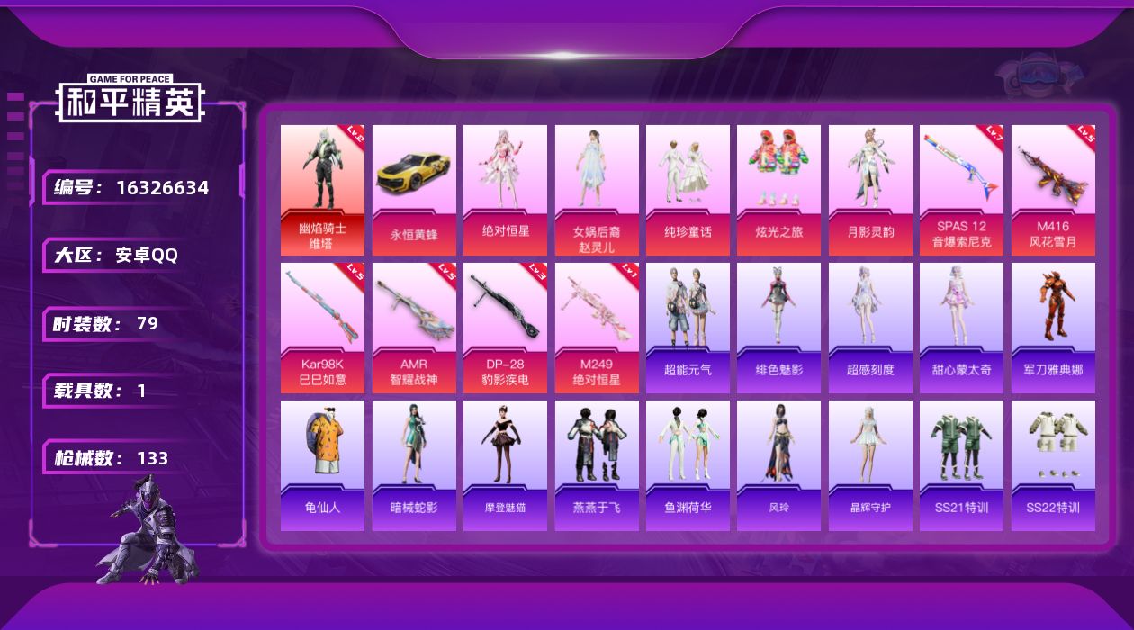 [16326634]【特价出售/店主推荐】安卓 手Q-1神装-5粉装-6特效枪-1载具-3粉色飞行器-41623热力值-2王牌印记-79套装-133枪皮【红色神装等级】:幽焰骑士-维塔(二级)【红色角色神装】:幽焰骑士-维塔【热门品类】:角色-军刀雅典娜,套装-龟仙人【粉色套装】:角色-绝对恒星,女娲后裔-赵灵儿,粉装-纯珍童话,粉装-炫光之旅,角色-月影灵韵【粉色枪皮等级】:M416-风花雪月(五级),Kar98K-巳巳如意(五级),AMR-智耀战神(五级),SPAS-12-音爆索尼克(七级),M249-绝对恒星(一级),DP-28-豹影疾电(三级【粉色载具】:永恒黄蜂【粉色枪皮】:M416-风花雪月,Kar98K-巳巳如意,AMR-智耀战神,SPAS-12-音爆索尼克,M249-绝对恒星,DP-28-豹影疾电【粉色飞行器】:绝对恒星飞行器,千面幻镜飞行器,月下星之子飞行器