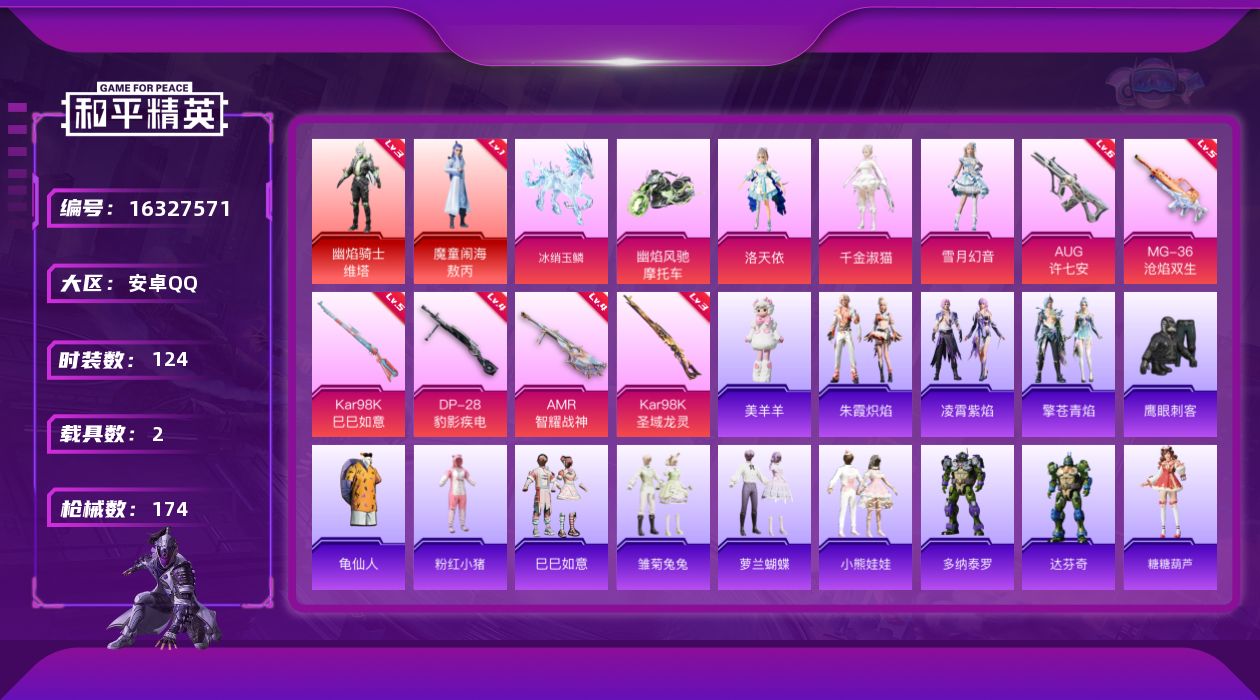 [16327571]【特价出售/店主推荐】安卓 手Q-2神装-3粉装-6特效枪-2载具-3粉色飞行器-60725热力值-9王牌印记-124套装-174枪皮【红色神装等级】:魔童闹海-敖丙(一级),幽焰骑士-维塔(三级)【红色角色神装】:魔童闹海-敖丙,幽焰骑士-维塔【热门品类】:套装-龟仙人,套装-粉红小猪【粉色套装】:角色-洛天依,角色-千金淑猫,粉装-雪月幻音【粉色枪皮等级】:AUG-许七安(六级),Kar98K-巳巳如意(五级),Kar98K-圣域龙灵(三级),AMR-智耀战神(四级),DP-28-豹影疾电(四级),MG-36-沧焰双生(五级)【粉色载具】:幽焰风驰摩托车,冰绡玉鳞【粉色枪皮】:AUG-许七安,Kar98K-巳巳如意,Kar98K-圣域龙灵,AMR-智耀战神,DP-28-豹影疾电,MG-36-沧焰双生【粉色飞行器】:幽焰列车飞行器,灵珠游龙飞行器