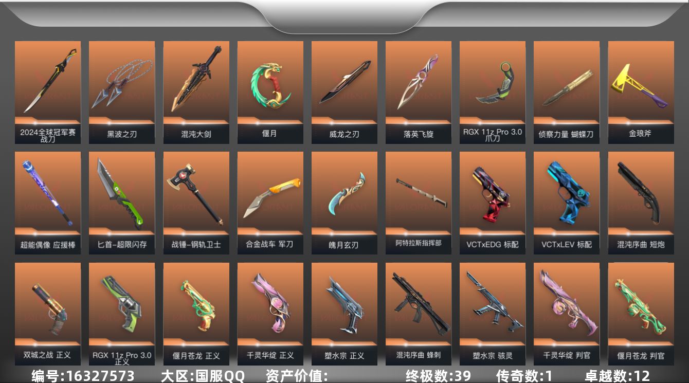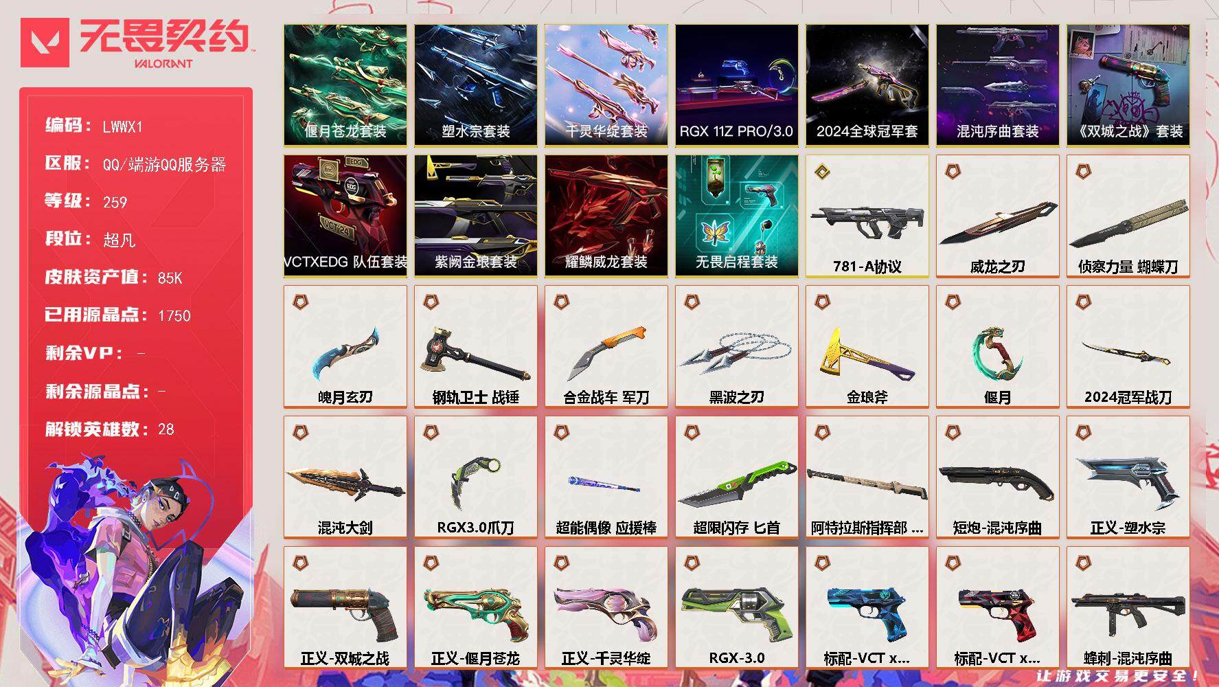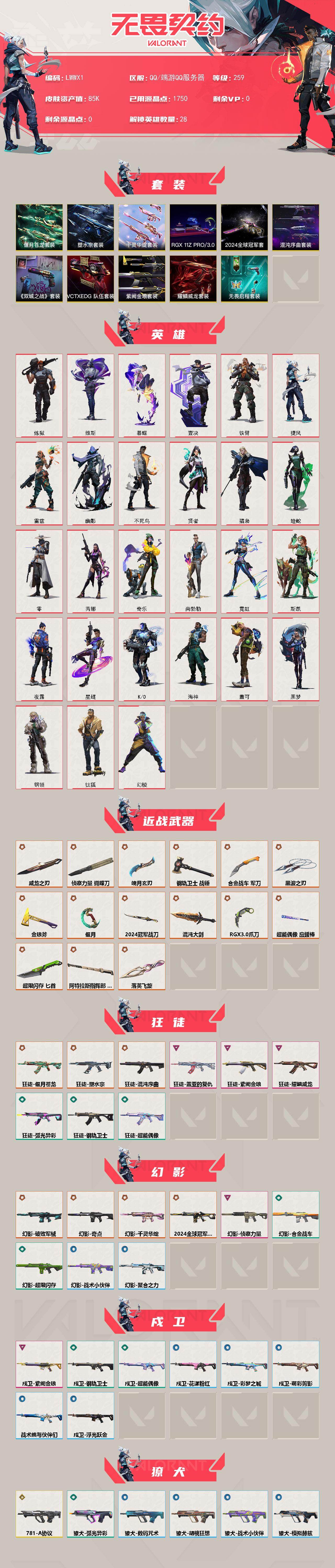 [16327573]【特价出售/店主推荐 神话挂坠 】【套装】:2024全球冠军赛套装,RGX 11z Pro//3.0套装,混沌序曲套装,塑水宗套装,《英雄联盟:双城之战》套装,千灵华绽套装,偃月苍龙套装,VCTxEDG 队伍套装,耀鳞威龙套装,紫阙金琅套装,无畏启程套装 【英雄】:幻棱,炼狱,维斯,暮蝶,钛狐,壹决,铁臂,捷风,雷兹,幽影,不死鸟,贤者,猎枭,蝰蛇,零,芮娜,奇乐,尚勃勒,霓虹,斯凯,夜露,星礈,K/O,海神,盖可,黑梦,钢锁 【近战武器】:近战武器-2024全球冠军赛 战刀,近战武器-侦察力量 蝴蝶刀,近战武器-RGX 11z Pro//3.0 爪刀,近战武器-黑波之刃,近战武器-落英飞旋,近战武器-威龙之刃,近战武器-混沌大剑,近战武器-超能偶像 应援棒,近战武器-超限闪存 匕首,近战武器-钢轨卫士 战锤,近战武器-合金战车 军刀,近战武器-金琅斧,近战武器-魄月玄刃,近战武器-偃月,近战武器-阿特拉斯指挥部 甩棍 【狂徒】:狂徒-混沌序曲,狂徒-塑水宗,狂徒-偃月苍龙,狂徒-盖亚的复仇,狂徒-耀鳞威龙,狂徒-紫阙金琅,狂徒-超能偶像,狂徒-钢轨卫士,狂徒-弧光异彩 【幻影】:幻影-2024全球冠军赛,幻影-破败军械,幻影-奇点,幻影-千灵华绽,幻影-侦察力量,幻影-超限闪存,幻影-合金战车,幻影-聚合之力,幻影-战术小伙伴 【戍卫】:戍卫-紫阙金琅,戍卫-超能偶像,戍卫-钢轨卫士,戍卫-彩梦之城,戍卫-浮光跃金,戍卫-花漾粉红,戍卫-萌彩剪影,戍卫-战术熊与伙伴们 【獠犬】:獠犬-781-A协议,獠犬-弧光异彩,獠犬-采蜜小蜂队,獠犬-胡桃狂想,獠犬-模拟赫兹,獠犬-数码咒术,獠犬-战术小伙伴 【冥驹】:冥驹-混沌序曲,冥驹-千灵华绽,冥驹-偃月苍龙,冥驹-胡桃狂想,冥驹-花漾粉红,冥驹-模拟赫兹 【飞将】:飞将-塑水宗,飞将-合金战车,飞将-沙尘幻旅,飞将-聚合之力,飞将-光导纤维,飞将-战术熊与伙伴们 【莽侠】:莽侠-RGX 11z Pro//3.0,莽侠-超限闪存,莽侠-纤云弄巧 【战神】:战神-盖亚的复仇//2.0,战神-采蜜小蜂队,战神-浮光跃金,战神-萌彩剪影,战神-深海水族,战神-数码咒术 【奥丁】:奥丁-紫阙金琅//2.0,奥丁-流星兵团,奥丁-信手涂鸦,奥丁-战术小伙伴 【判官】:判官-千灵华绽,判官-偃月苍龙,判官-超能偶像,判官-采蜜小