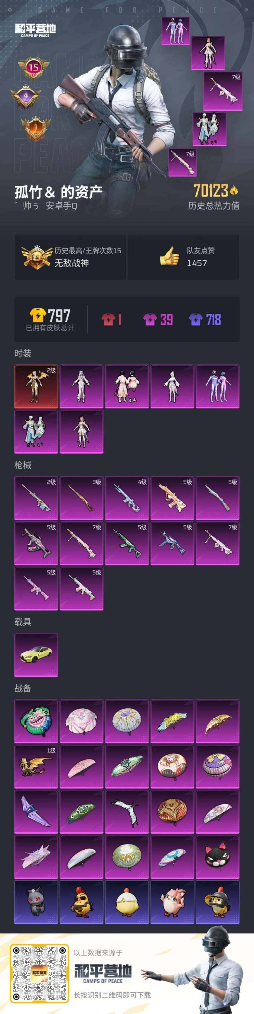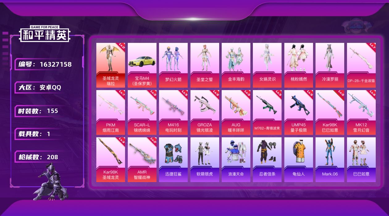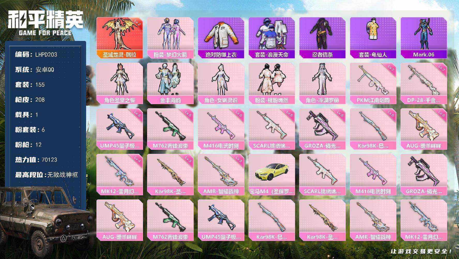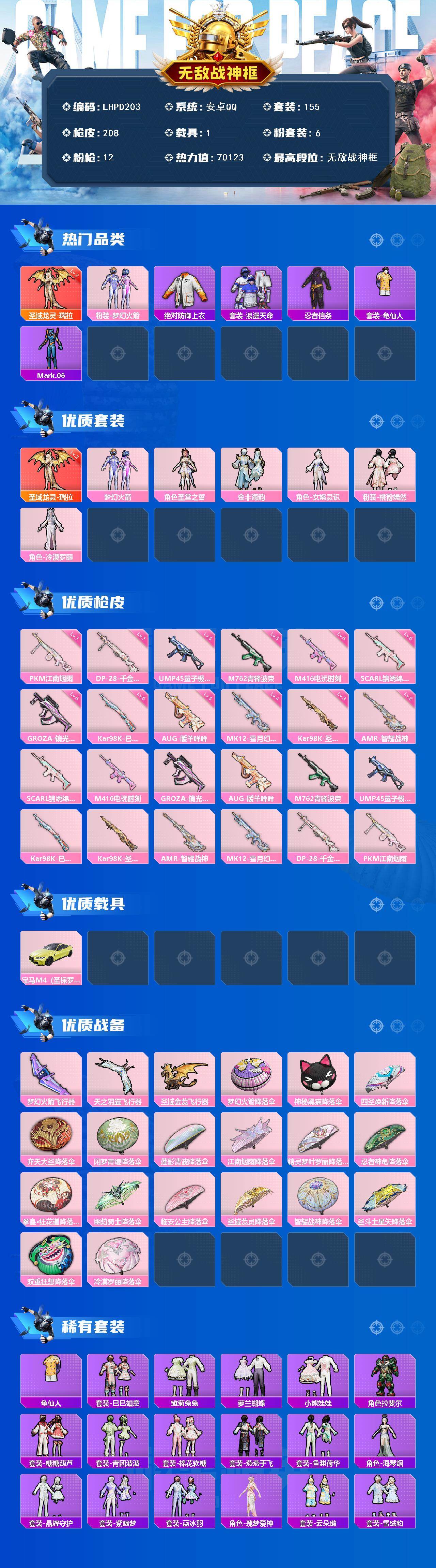 [16327158]【特价出售/店主推荐】安卓 手Q-无敌战神框-1神装-6粉装-12特效枪-1载具-3粉色飞行器-70123热力值-15王牌印记-155套装-208枪皮【红色神装等级】:圣域龙灵-瑞拉(二级)【红色角色神装】:圣域龙灵-瑞拉【热门品类】:粉装-梦幻火箭,绝对防御上衣,套装-浪漫天命,套装-忍者信条,套装-龟仙人,角色-Mark.06【粉色套装】:粉装-梦幻火箭,角色-圣堂之誓,粉装-金丰海韵,角色-女娲灵识,粉装-桃粉嫣然,角色-冷漠罗丽【粉色枪皮等级】:SCAR-L-锦绣绵绵(五级),M416-电玩时刻(五级),GROZA-镜光银凌(五级),AUG-暖羊咩咩(五级),M762-青锋波束(五级),UMP45-量子极限(五级),Kar98K-巳巳如意(五级),Kar98K-圣域龙灵(三级),AMR-智耀战神(二级),MK12-雪月幻音(四级),DP-28-千金淑猫(七级),PKM-江南烟雨(七级)【粉色载具】:宝马M4(圣保罗黄)【粉色枪皮】:SCAR-L-锦绣绵绵,M416-电玩时刻,GROZA-镜光银凌,AUG-暖羊咩咩,M762-青锋波束,UMP45-量子极限,Kar98K-巳巳如意,Kar98K-圣域龙灵,AMR-智耀战神,MK12-雪月幻音,DP-28-千金淑猫,PKM-江南烟雨【粉色飞行器】:梦幻火箭飞行器,天之羽翼飞行器,圣域金龙飞行器