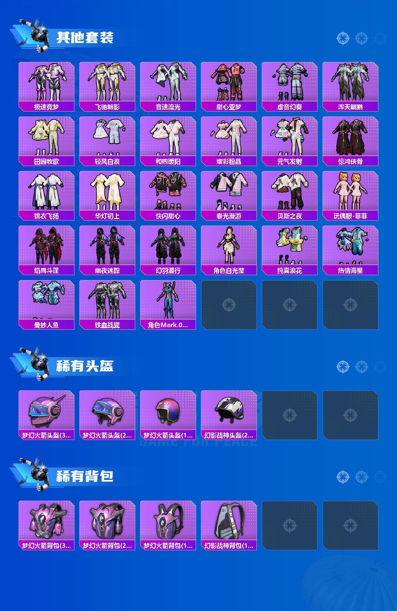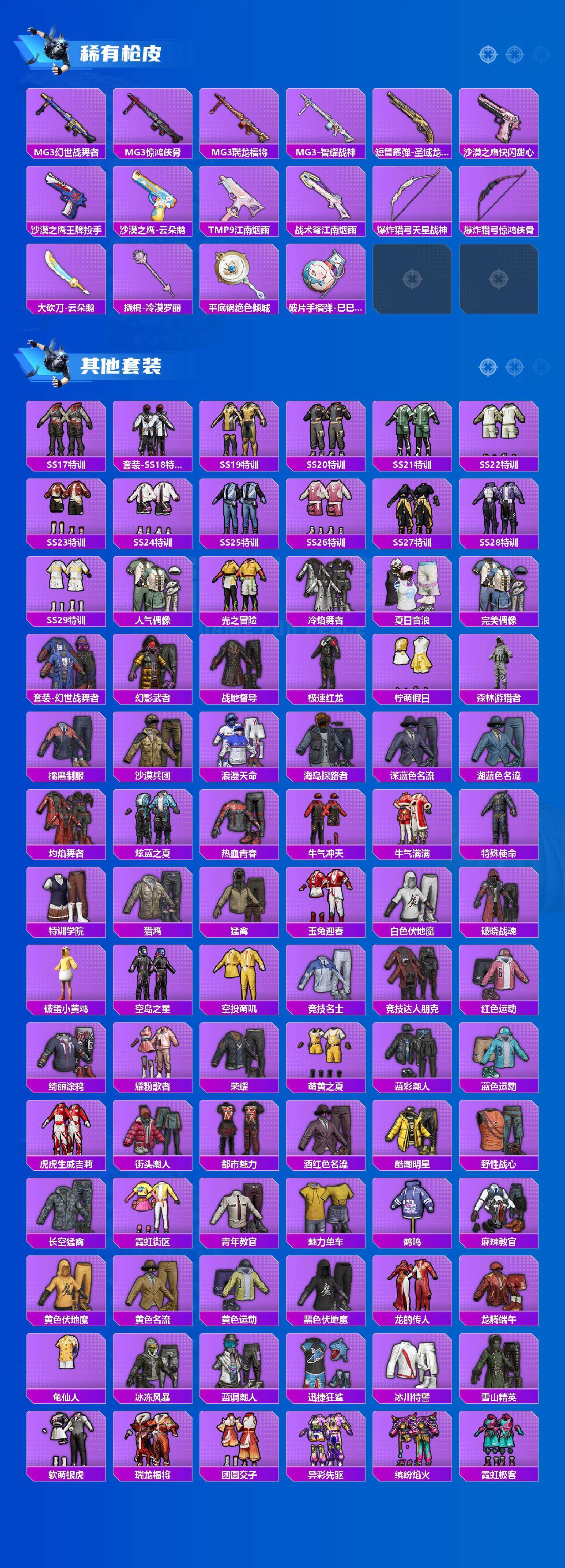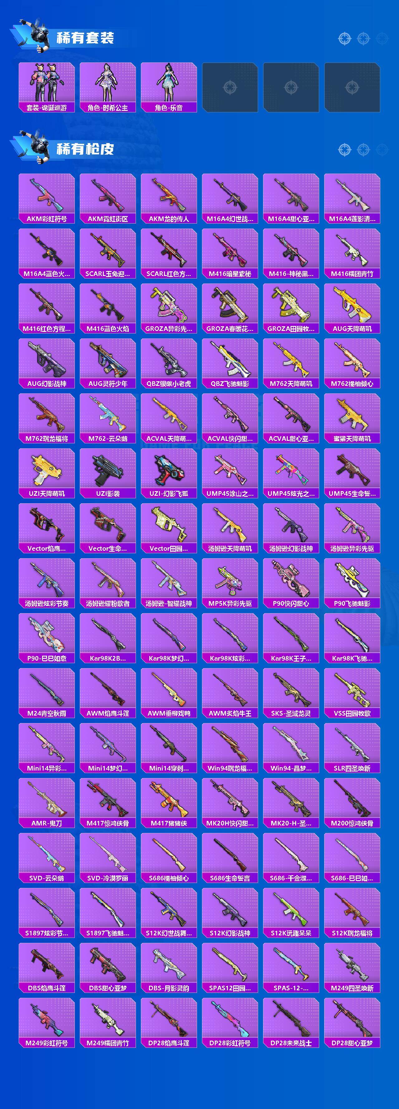 SCAR-L-锦绣绵绵,M416-电玩时刻,GROZA-镜光银凌,AUG-暖羊咩咩,M762-青锋波束,UMP45-量子极限,Kar98K-巳巳如意,Kar98K-圣域龙灵,MK12-雪月幻音,DP-28-千金淑猫,PKM-江南烟雨