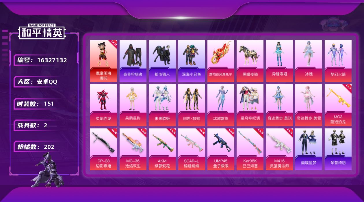 [16327132]【特价出售/店主推荐】安卓 手Q-1神装-12粉装-8特效枪-2载具-7粉色飞行器-68658热力值-14王牌印记-151套装-202枪皮【红色神装等级】:魔童闹海-哪吒(二级)【红色角色神装】:魔童闹海-哪吒【热门品类】:粉装-梦幻火箭,套装-都市猎人,套装-深海小丑鱼,套装-小丑鱼,套装-奇异狩猎者,套装-龟仙人,套装-暗影哥特,角色-Mark.06【粉色套装】:粉装-梦幻火箭,粉装-炙焰赤龙,角色-呆萌星弥,粉装-未来歌姬,套装-创世·救赎,角色-冰域雷影,粉装-星穹咏叹调,角色-奇迹舞步 美琪,角色-奇迹舞步 美雪,角色-冰魄,角色-异瞳寒姬【粉色枪皮等级】:AKM-绿萝繁花(五级),SCAR-L-锦绣绵绵(五级),M416-灵猫魔法师(三级),UMP45-量子极限(五级),Kar98K-巳巳如意(五级),DP-28-豹影疾电(五级),MG3-酷泡奶龙(七级),MG-36-沧焰双生(五级)【粉色载具】:踏焰逐风摩托车,黑曜夜骑【粉色枪皮】:AKM-绿萝繁花,SCAR-L-锦绣绵绵,M416-灵猫魔法师,UMP45-量子极限,Kar98K-巳巳如意,DP-28-豹影疾电,MG3-酷泡奶龙,MG-36-沧焰双生【粉色飞行器】:太空嘟嘟飞行器,灵猫魔法师飞行器,飞天猪飞行器,灵珠游龙飞行器,极意拳锋飞行器