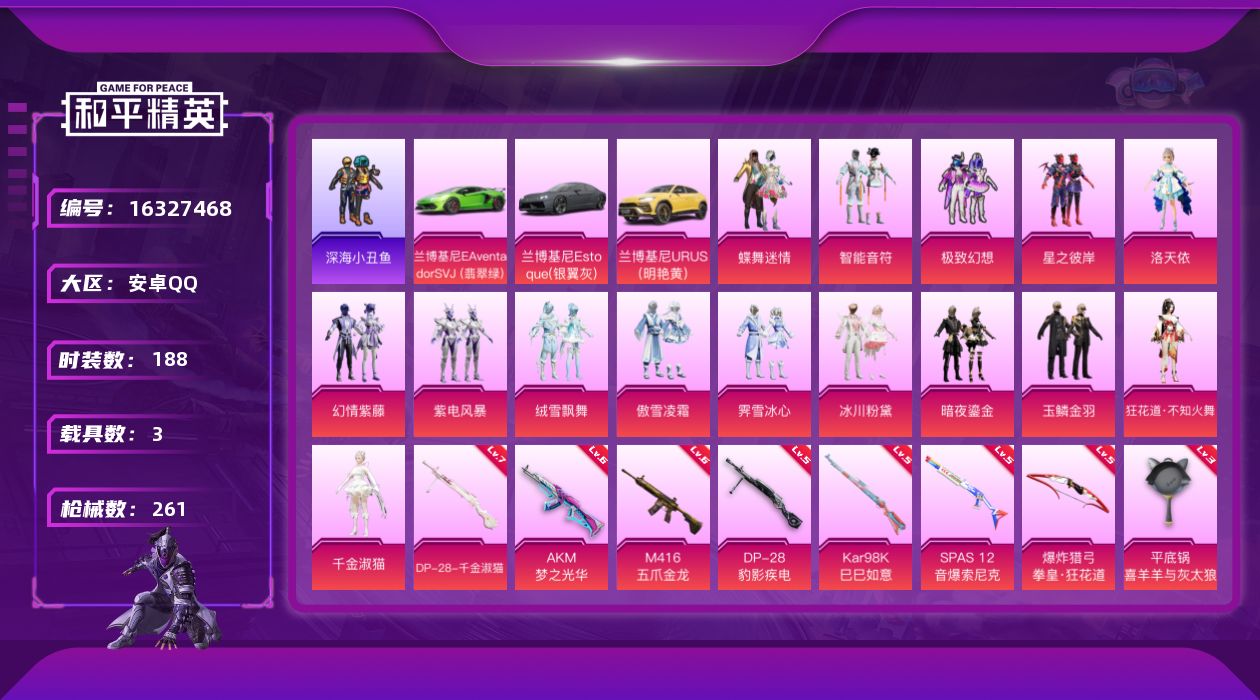 [16327468]【特价出售/店主推荐】安卓 手Q-17粉装-9特效枪-3载具-6粉色飞行器-90842热力值-10王牌印记-188套装-261枪皮【热门品类】:套装-浪漫天命,套装-深海小丑鱼,角色-军刀雅典娜,套装-龟仙人,套装-暗影哥特【粉色套装】:粉装-蝶舞迷情,粉装-智能音符,粉装-极致幻想,粉装-星之彼岸,角色-洛天依,粉装-幻情紫藤,粉装-紫电风暴,粉装-绒雪飘舞,粉装-傲雪凌霜,粉装-霁雪冰心,粉装-冰川粉黛,粉装-暗夜鎏金,粉装-玉鳞金羽,角色-狂花道·不知火舞,角色-千金淑猫【粉色枪皮等级】:AKM-梦之光华(六级),M416-五爪金龙(六级),P90-沙丘之主(三级),Kar98K-巳巳如意(五级),SPAS-12-音爆索尼克(五级),DP-28-千金淑猫(七级),DP-28-豹影疾电(五级),爆炸猎弓-拳皇·狂花道(五级),平底锅-喜羊羊与灰太狼(三级)【粉色载具】:兰博基尼Aventador SVJ(翡翠绿),兰博基尼Estoque(银翼灰),兰博基尼URUS(明艳黄)【粉色枪皮】:AKM-梦之光华,M416-五爪金龙,P90-沙丘之主,Kar98K-巳巳如意,SPAS-12-音爆索尼克,DP-28-千金淑猫,DP-28-豹影疾电,爆炸猎弓-拳皇·狂花道,平底锅-喜羊羊与灰太狼【粉色飞行器】:春暖花开飞行器,黄族统领飞行器,沙丘之主天马,镜域双华-灵镜之阶