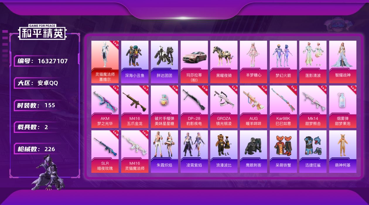 [16327107]【店主推荐捡漏号!可直接换绑】安卓 手Q-1神装-4粉装-11特效枪-2载具-4粉色飞行器-73824热力值-8王牌印记-155套装-226枪皮【红色神装等级】:灵猫魔法师-塞维尔(二级)【红色角色神装】:灵猫魔法师-塞维尔【热门品类】:粉装-梦幻火箭,套装-浪漫天命,套装-深海小丑鱼,套装-小丑鱼,套装-胖达团团,套装-金羽特工,套装-龟仙人,套装-暗影哥特,套装-浪漫波比,角色-六号稻草人【粉色套装】:粉装-梦幻火箭,粉装-莲影清波,角色-智耀战神,角色-羊梦糖心【粉色枪皮等级】:AKM-梦之光华(七级),M416-五爪金龙(七级),M416-灵猫魔法师(三级),GROZA-镜光银凌(五级),AUG-暖羊咩咩(五级),Kar98K-巳巳如意(五级),Mk14-甜梦熊击(五级),SLR-暗夜玫瑰(四级),DP-28-豹影疾电(五级),烟雾弹-甜梦果泡(五级),破片手榴弹-美味星星糖(六级)【粉色载具】:玛莎拉蒂Ghibli(粉),黑曜夜骑【粉色枪皮】:AKM-梦之光华,M416-五爪金龙,M416-灵猫魔法师,GROZA-镜光银凌,AUG-暖羊咩咩,Kar98K-巳巳如意,Mk14-甜梦熊击,SLR-暗夜玫瑰,DP-28-豹影疾电,烟雾弹-甜梦果泡,破片手榴弹-美味星星糖【粉色飞行器】:梦幻火箭飞行器,沙丘之主天马,灵猫魔法师飞行器