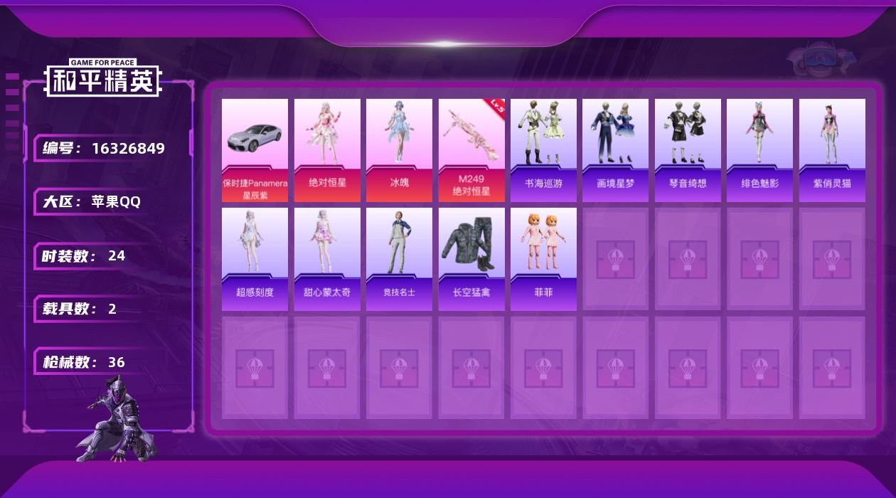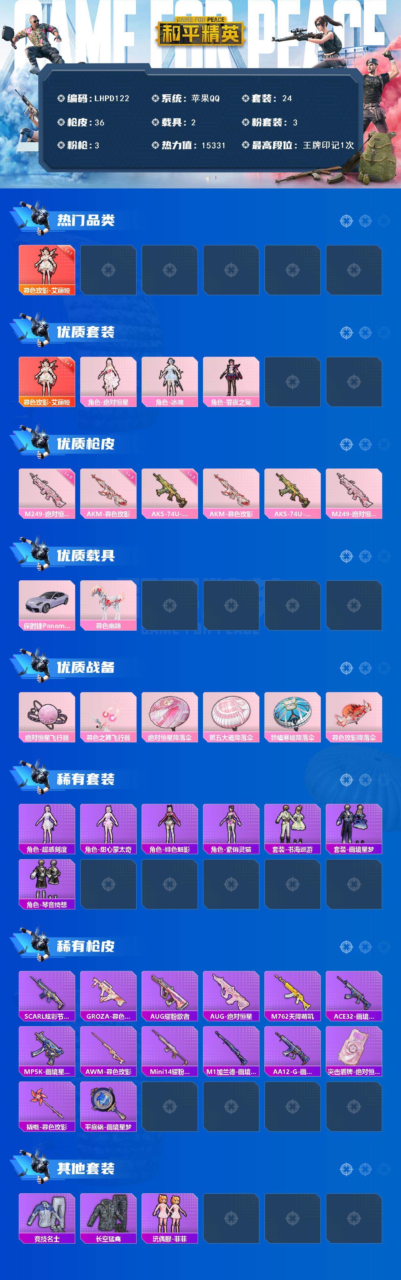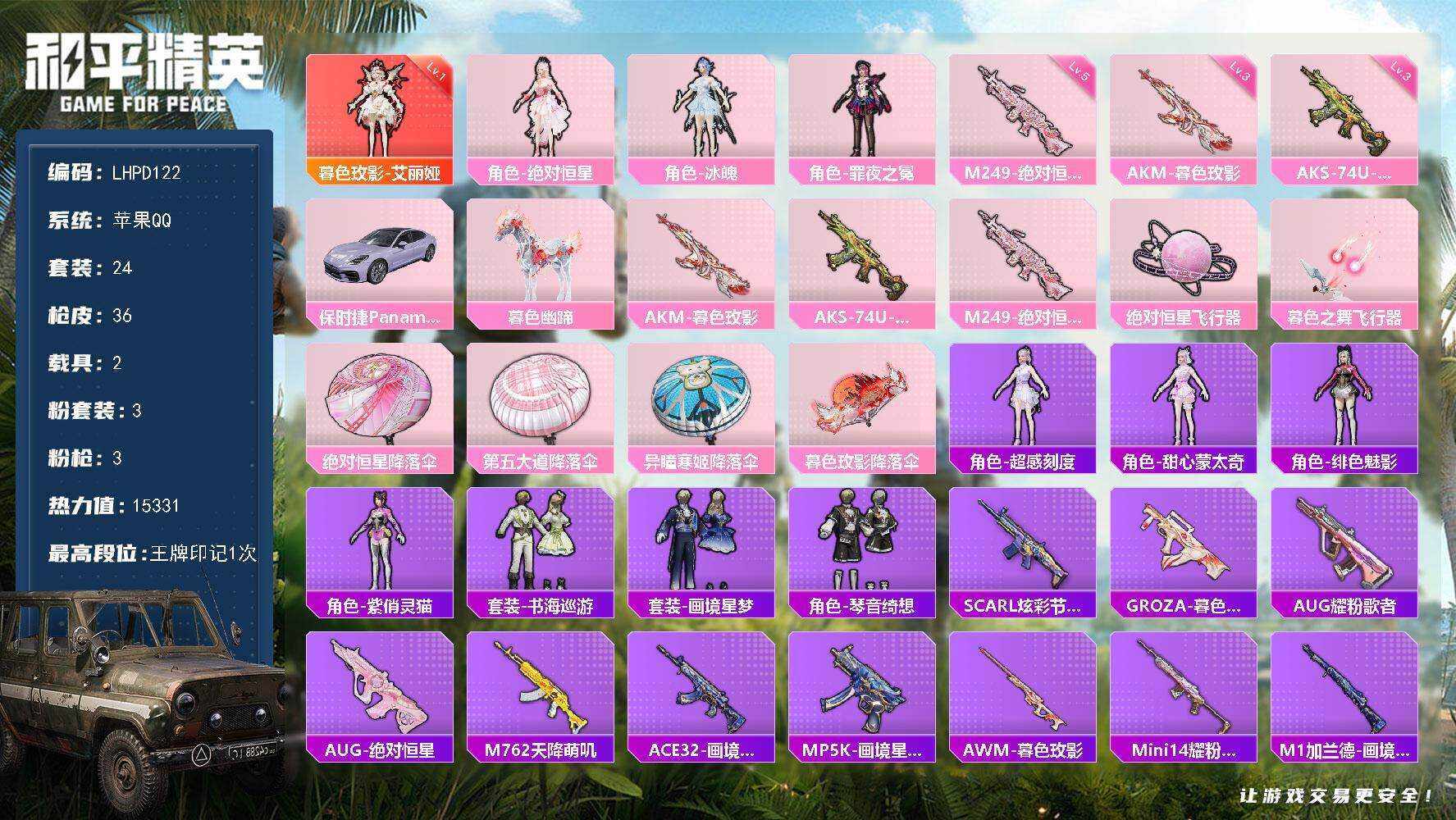 [16326849]【特价出售/店主推荐】苹果 手Q-1神装-3粉装-3特效枪-2载具-3粉色飞行器-15331热力值-1王牌印记-24套装-36枪皮【红色神装等级】:暮色玫影-艾丽娅(一级)【红色角色神装】:暮色玫影-艾丽娅【粉色套装】:角色-绝对恒星,角色-冰魄,角色-罪夜之冕【粉色枪皮等级】:AKM-暮色玫影(三级),AKS-74U-森灵之息(三级),M249-绝对恒星(五级)【粉色载具】:保时捷Panamera(星辰紫),暮色幽蹄【粉色枪皮】:AKM-暮色玫影,AKS-74U-森灵之息,M249-绝对恒星【粉色飞行器】:绝对恒星飞行器,暮色之舞飞行器