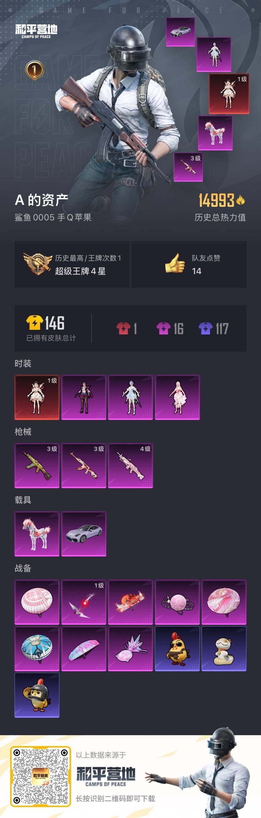- [15614093]安卓 手Q-1神装-14粉装-10特效枪-4载具-8粉色飞行器-57706热力值-7王牌印记-96套装-164枪皮 【红色神装等级】:精灵之光-露米娜(一级) 【热门品类】:粉装-梦幻火箭,套装-六号树人,套装-龟仙人,角色-8号机,角色-Mark.06,撬棍-龙胆亮银枪 【粉色套装】:粉装-梦幻火箭,粉装-橘柚倾心,角色-歌者泠鸢,粉装-第五大道,粉装-仲夏莫吉托,粉装-暖暖奶龙,角色-小蓝,角色-脉冲星,角色-超弦星,角色-光极星,角色-星梦奇缘,角色-守护天翼,角色-金域紫灵,粉装-金丰海韵 【粉色枪皮等级】:M416-风花雪月(一级),M416-墨龙九天(三级),P90-金丰海韵(四级),Kar98K-巳巳如意(五级),AWM-橘柚倾心(四级),M417-第五大道(四级),DP-28-豹影疾电(五级),MG3-洛神天依(四级) 【粉色载具】:路特斯EVIJA(星际黄),路特斯ELETRE(冰川蓝),仰望U7(阿盖尔紫),星梦玉骢 【粉色枪皮】:M416-风花雪月,M416-墨龙九天,P90-金丰海韵,Kar98K-巳巳如意,AWM-橘柚倾心,M417-第五大道,DP-28-豹影疾电,MG3-洛神天依,烟雾弹-猫咪绅士,破片手榴弹-秋玉花灯 【粉色飞行器】:天之羽翼飞行器,沙丘之主天马,镜域双华-灵镜之阶,辉耀战甲飞行器,龙翔九天飞行器,幻海精灵飞行器,深渊漩涡飞行器,曦光华影飞行器 【粉色降落伞】:洛神天依降落伞,天之羽翼降落伞,恐龙拽拽降落伞,橘柚倾心降落伞,第五大道降落伞,仲夏莫吉托降落伞,莲影清波降落伞,萌酷奶龙降落伞,圣堂之誓降落伞,沙丘之主降落伞,小叽联名款降落伞,辉耀战甲降落伞,江南烟雨降落伞,巴啦啦小魔仙降落伞,电糖天使降落伞,精灵梦叶罗丽降落伞,墨龙九天降落伞,创世·救赎降落伞,星梦奇缘降落伞,守护天翼降落伞,初号机 觉醒Ver.降落伞 【稀有套装】:套装-龟仙人,套装-巳巳如意,套装-雏菊兔兔,套装-萝兰蝴蝶,角色-摩登魅猫,角色-紫俏灵猫 【稀有枪皮】:AKM-霓虹街区,M16A4-天使羽翼,M16A4-莲影清波,M416-糯团青竹,GROZA-酷泡奶龙,AUG-辉耀战甲,AUG-纯梦嫁纱,QBZ-洛神天依,M762-橘柚倾心,M762-第五大道,Mk47-洛神天依,AC-VAL-天降萌叽,AC-VAL-快闪甜心,蜜獾-千面幻镜,蜜獾-