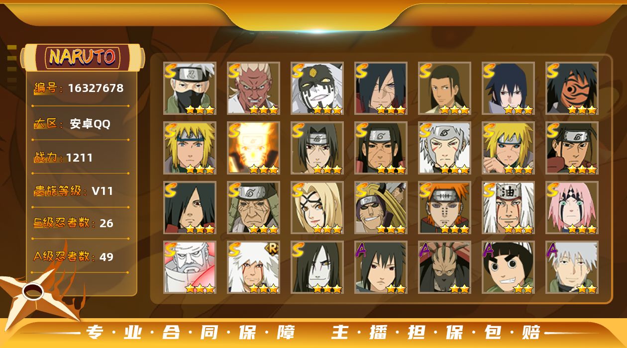[16327678]v11 战力1211w 26s 49a 4个198a 4700金币 580点券 1980限时点券 四星佩恩 47片纲手