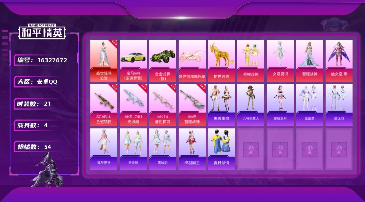 [16327672]【特价出售/店主推荐】安卓 手Q-1神装-4粉装-4特效枪-4载具-3粉色飞行器-21511热力值-3王牌印记-21套装-54枪皮【红色神装等级】:盛世惊鸿-云鸾(二级)【红色角色神装】:盛世惊鸿-云鸾【热门品类】:角色-六号稻草人【粉色套装】:粉装-垂柳戏鸭,角色-女娲灵识,角色-智耀战神,角色-仙女座 瞬【粉色枪皮等级】:SCAR-L-金蛇镇世(五级),AKS-74U-无垠阁(一级),Mk14-盛世惊鸿(一级),AMR-智耀战神(一级)【粉色载具】:宝马M4(圣保罗黄),合金龙骨(绿),盛世惊鸿摩托车,护世瑞兽【粉色枪皮】:SCAR-L-金蛇镇世,AKS-74U-无垠阁,Mk14-盛世惊鸿,AMR-智耀战神【粉色飞行器】:凤舞九天飞行器,万象金身飞行器