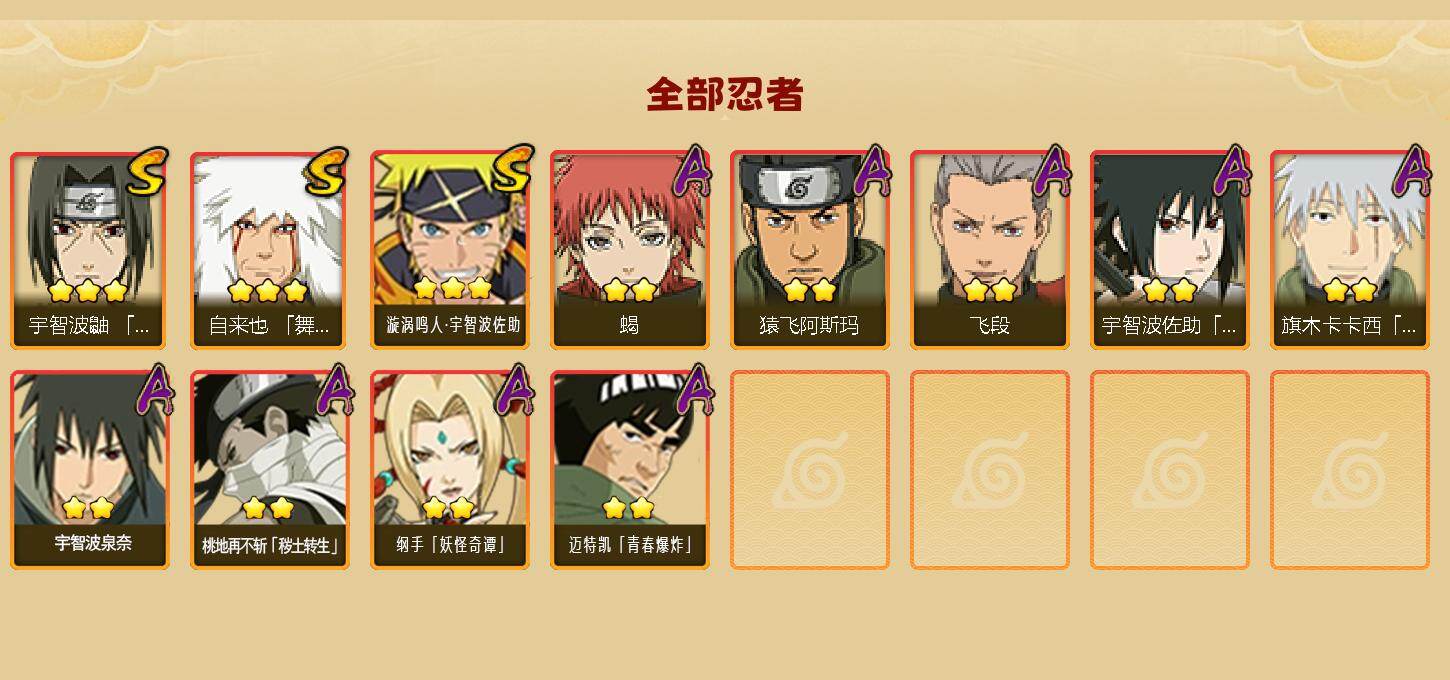 【S级忍者】:宇智波鼬「须佐能乎」(3星),自来也「舞之豪杰」(3星),漩涡鸣人·宇智波佐助(3星)