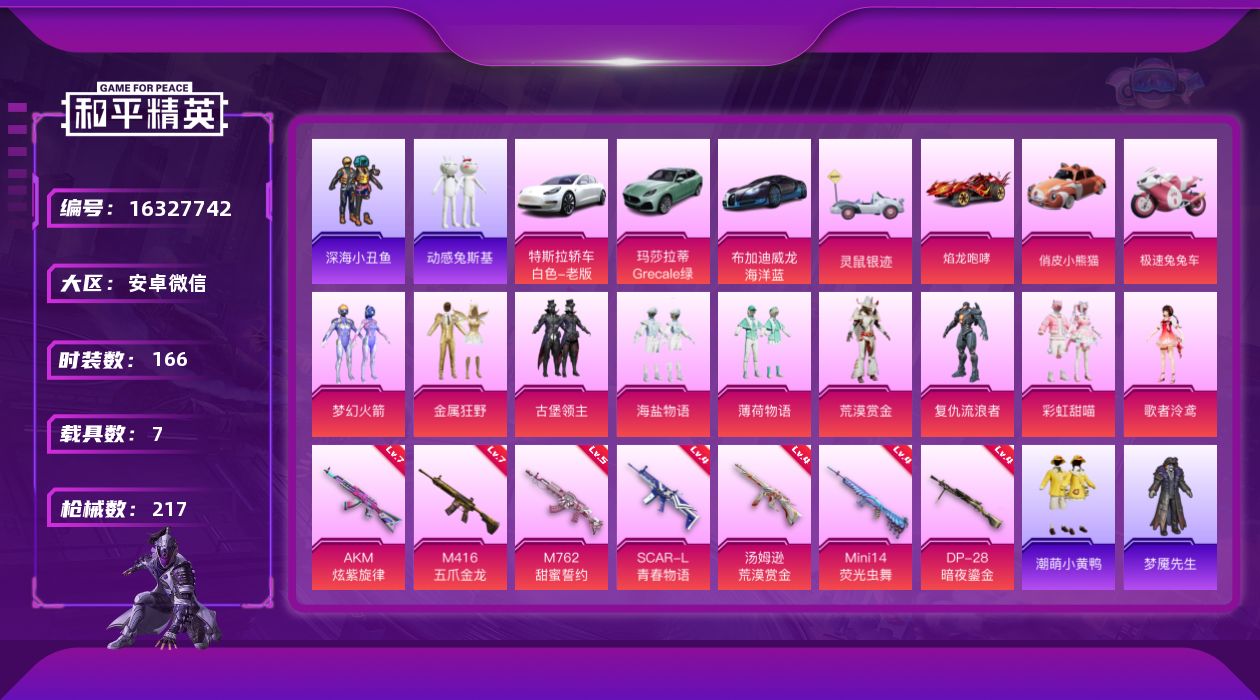 - [16891349]安卓 手Q-5粉装-5特效枪-1载具-2粉色飞行器-54995热力值-14王牌印记-123套装-163枪皮 【热门品类】:粉装-缤纷油彩,套装-小丑鱼,套装-龟仙人,套装-潮萌小黄鸭,套装-浪漫波比 【粉色套装】:粉装-缤纷油彩,粉装-炙焰红王,粉装-馨动时刻,粉装-蝶舞蔷薇,粉装-暗夜玫瑰 【粉色枪皮等级】:M416-心之恋语(七级),UMP45-相思残雪(六级),Kar98K-巳巳如意(五级),DP-28-枪炮玫瑰(四级),DP-28-豹影疾电(五级) 【粉色载具】:特斯拉Roadster(水滴蓝) 【粉色枪皮】:M416-心之恋语,UMP45-相思残雪,Kar98K-巳巳如意,DP-28-枪炮玫瑰,DP-28-豹影疾电 【粉色飞行器】:炫彩糖果飞行器,梦幻火箭飞行器 【粉色降落伞】:甜心宝贝降落伞,绮梦青鸾降落伞,星之彼岸降落伞,相思残雪降落伞,暗夜玫瑰降落伞,红伞翩翩降落伞,恐龙拽拽降落伞,喜羊羊与灰太狼降落伞,炫彩糖果降落伞 【稀有套装】:套装-龟仙人,套装-巳巳如意,套装-炫彩糖果 【稀有枪皮】:AKM-夜灯,AKM-山经魅狐,AKM-破晓战魂,AKM-筑梦精灵,AKM-萌趣颜团子,AKM-虎虎生威,AKM-霓虹街区,AKM-龙的传人,M16A4-幻世战舞者,M16A4-甜心亚梦,M16A4-红色方程式,M16A4-蓝色火焰,SCAR-L-炫彩节奏,SCAR-L-玉兔迎春,SCAR-L-红色方程式,M416-仓鼠灰灰,M416-糯团青竹,M416-红色方程式,M416-绯红前夜,M416-罗小黑,M416-蓝色火焰,GROZA-异彩先驱,GROZA-彩虹符号,GROZA-治愈之星,GROZA-黑色刀锋,AUG-耀粉歌者,AUG-青春冒险家,QBZ-彩虹符号,QBZ-洛神天依,QBZ-电玩视界,QBZ-赛罗,QBZ-飞驰魅影,M762-枪炮玫瑰,M762-橘柚倾心,M762-烈焰拳霸,M762-瑞龙福将,M762-甜心宝贝,Mk47-洛神天依,Mk47-青春冒险家,G36C-时空追击者,G36C-暗夜玫瑰,AC-VAL-甜心亚梦,蜜獾-天降萌叽,UZI-天降萌叽,UZI-炫彩节奏,UZI-红色方程式,UMP45-时空追击者,UMP45-蓝色火焰,Vector-彩虹符号,Vector-枪炮玫瑰,Vector-治愈之星,Vector-生命誓言,汤姆逊-天降萌