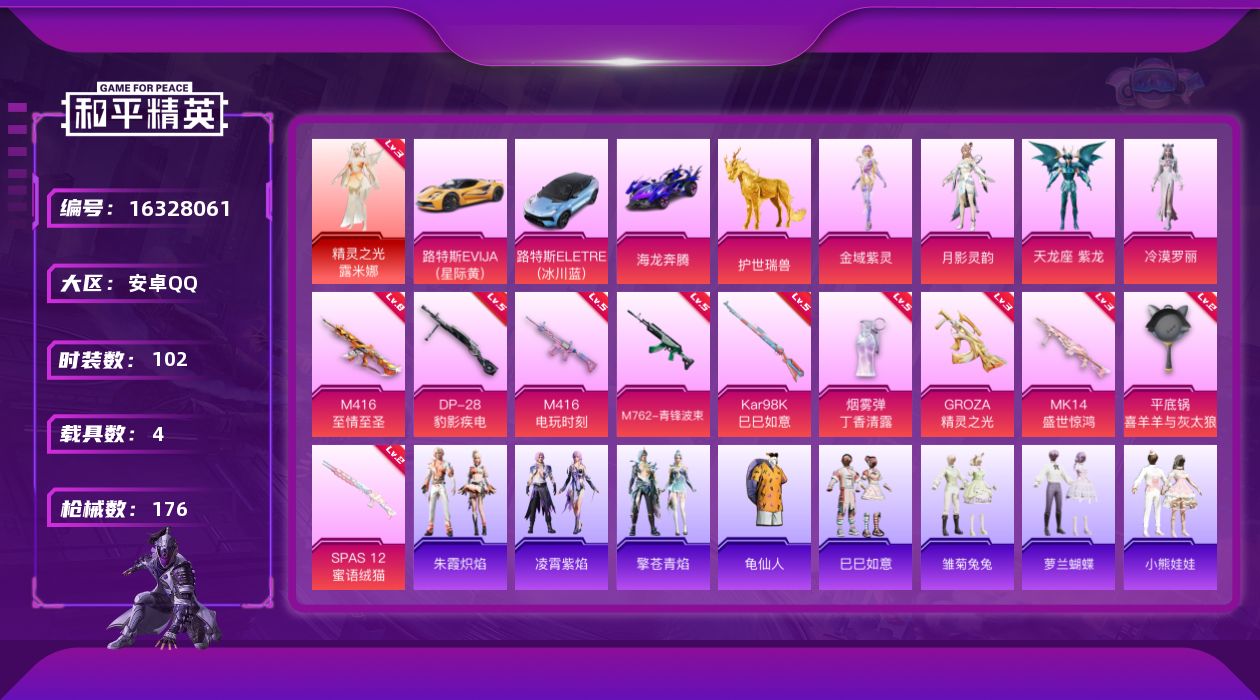 [16328061]【店主推荐捡漏号!可直接换绑】安卓 手Q-1神装-4粉装-10特效枪-4载具-5粉色飞行器-57574热力值-7王牌印记-102套装-176枪皮【红色神装等级】:精灵之光-露米娜(三级)【红色角色神装】:精灵之光-露米娜【热门品类】:套装-龟仙人【粉色套装】:角色-金域紫灵,角色-月影灵韵,角色-天龙座 紫龙,角色-冷漠罗丽【粉色枪皮等级】:M416-至情至圣(八级),M416-电玩时刻(五级),GROZA-精灵之光(三级),M762-青锋波束(五级),Kar98K-巳巳如意(五级),Mk14-盛世惊鸿(三级),SPAS-12-蜜语绒猫(二级),DP-28-豹影疾电(五级),平底锅-喜羊羊与灰太狼(二级),烟雾弹-丁香清露(五级)【粉色载具】:路特斯EVIJA(星际黄),路特斯ELETRE(冰川蓝),海龙奔腾,护世瑞兽【粉色枪皮】:M416-至情至圣,M416-电玩时刻,GROZA-精灵之光,M762-青锋波束,Kar98K-巳巳如意,Mk14-盛世惊鸿,SPAS-12-蜜语绒猫,DP-28-豹影疾电,平底锅-喜羊羊与灰太狼,烟雾弹-丁香清露【粉色飞行器】:酣梦熊熊飞行器,龙翔九天飞行器,曦光华影飞行器,凤舞九天飞行器