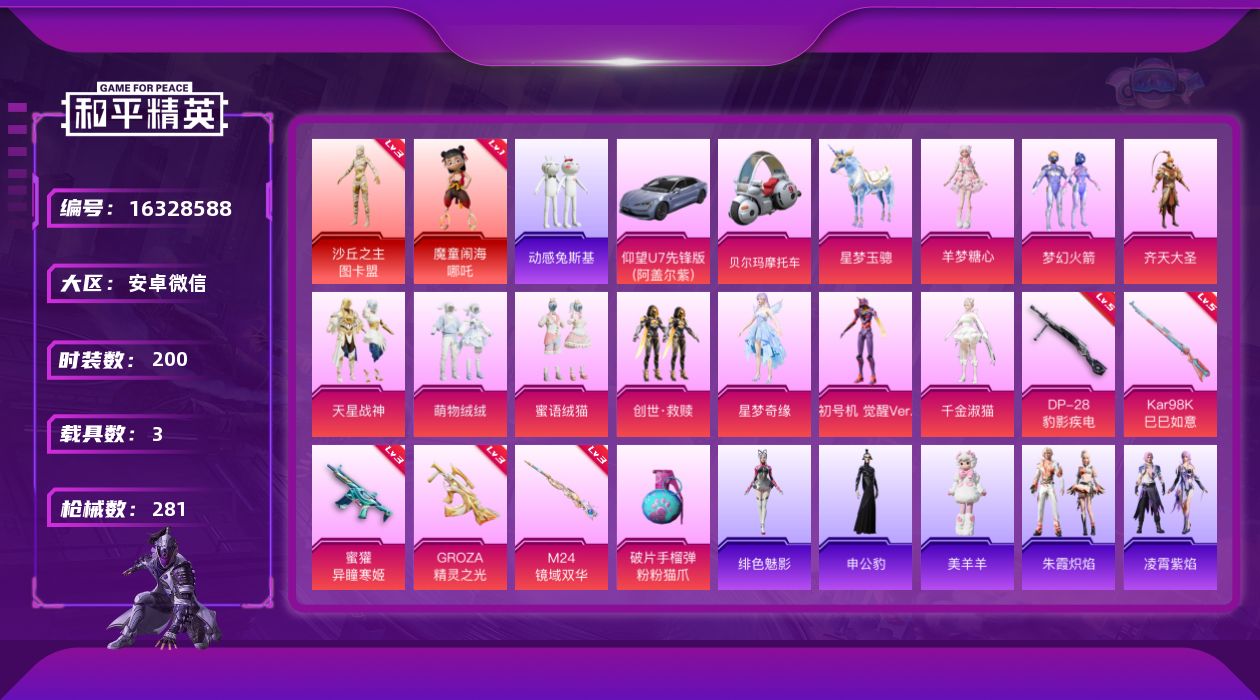 [16328588]【特价出售/店主推荐】安卓 微信-2神装-10粉装-6特效枪-3载具-13粉色飞行器-90965热力值-15王牌印记-200套装-281枪皮【红色神装等级】:魔童闹海-哪吒(一级),沙丘之主-图卡盟(三级)【红色角色神装】:魔童闹海-哪吒,沙丘之主-图卡盟【热门品类】:粉装-梦幻火箭,套装-动感兔斯基人偶服,套装-龟仙人,角色-8号机,角色-Mark.06【粉色套装】:粉装-梦幻火箭,粉装-齐天大圣,粉装-天星战神,粉装-萌物绒绒,粉装-蜜语绒猫,套装-创世·救赎,角色-星梦奇缘,角色-初号机 觉醒Ver.,角色-千金淑猫,角色-羊梦糖心【粉色枪皮等级】:GROZA-精灵之光(三级),蜜獾-异瞳寒姬(三级),Kar98K-巳巳如意(五级),M24-镜域双华(三级),DP-28-豹影疾电(五级)【粉色载具】:仰望U7(阿盖尔紫),布尔玛摩托车,星梦玉骢【粉色枪皮】:GROZA-精灵之光,蜜獾-异瞳寒姬,Kar98K-巳巳如意,M24-镜域双华,DP-28-豹影疾电,破片手榴弹-粉粉猫爪【粉色飞行器】:酣梦熊熊飞行器,齐天大圣飞行器,萌物绒绒飞行器,沙丘之主天马,镜域双华-灵镜之阶,星空武士飞行器,深渊漩涡飞行器,曦光华影飞行器,动力核心飞行器,凤舞九天飞行器,飞天猪飞行器