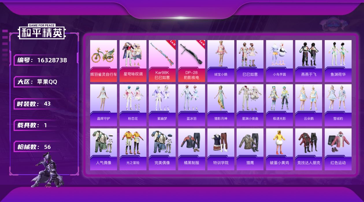 - PX_2111803- 苹果手Q-2王牌印记-4粉装-5特效枪-0载具-33089热力值-74套装-98枪皮-1卓越印记-0传奇印记 【4粉装】,冷漠罗丽,紫电风暴,炙焰牛王,绮梦青鸾 【5特效枪】SCAR-L-甜梦小狐-6级 GROZA-镜光银凌-5级 AUG-暖羊咩咩-5级 Kar98K-巳巳如意-5级 M24-暗星紫秘-5级 【2稀有紫装】,小丑鱼,龟仙人, 【74稀有时装】,SS31特训