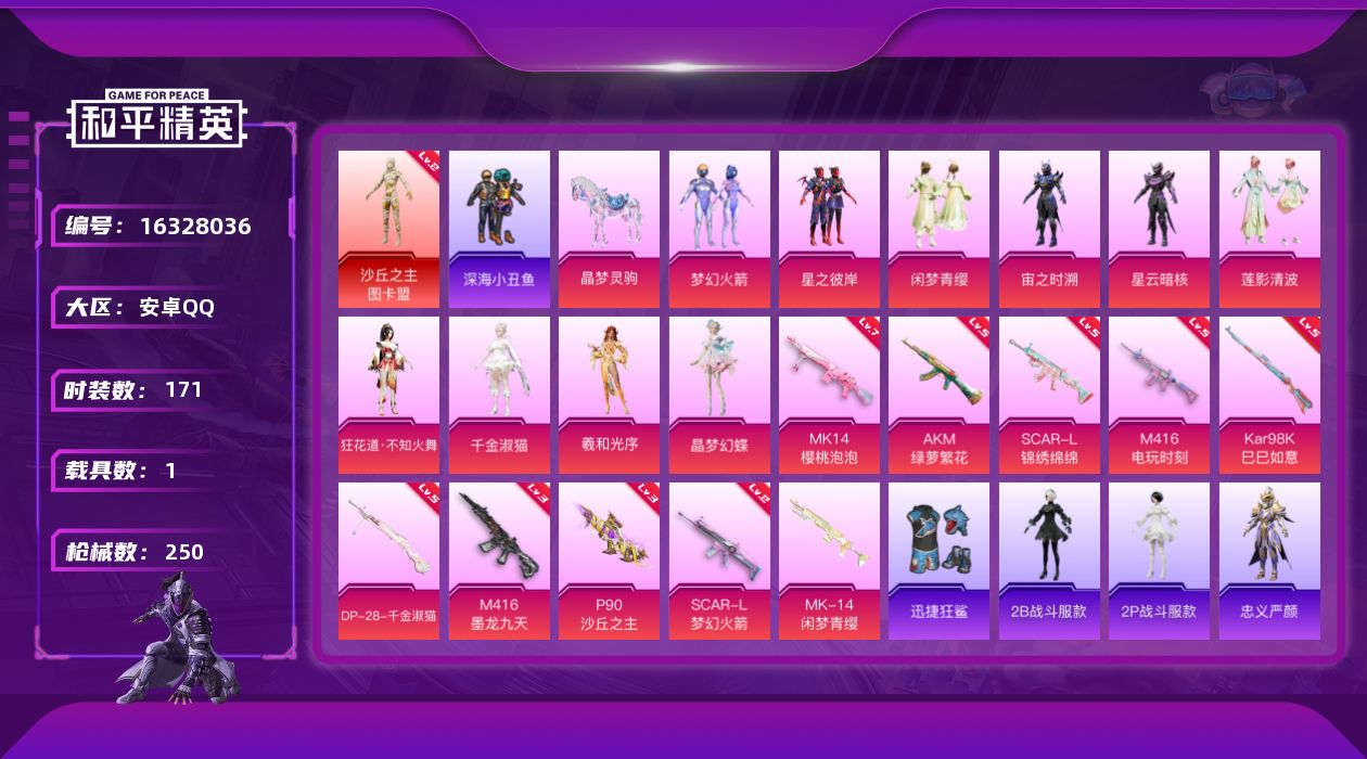 [16328036]【特价出售/店主推荐】安卓 手Q-1神装-10粉装-10特效枪-1载具-8粉色飞行器-85007热力值-12王牌印记-171套装-250枪皮【红色神装等级】:沙丘之主-图卡盟(二级)【红色角色神装】:沙丘之主-图卡盟【热门品类】:粉装-梦幻火箭,套装-深海小丑鱼,角色-2B战斗服款,角色-2P战斗服款,角色-忠义严颜,套装-六号树人,套装-龟仙人,套装-红红火火【粉色套装】:粉装-梦幻火箭,粉装-星之彼岸,粉装-闲梦青缨,角色-宙之时溯,角色-星云暗核,粉装-莲影清波,角色-狂花道·不知火舞,角色-千金淑猫,角色-羲和光序,角色-晶梦幻蝶【粉色枪皮等级】:AKM-绿萝繁花(五级),SCAR-L-梦幻火箭(二级),SCAR-L-锦绣绵绵(五级),M416-电玩时刻(五级),M416-墨龙九天(三级),P90-沙丘之主(三级),Kar98K-巳巳如意(五级),Mk14-樱桃泡泡(七级),DP-28-千金淑猫(五级)【粉色载具】:晶梦灵驹【粉色枪皮】:AKM-绿萝繁花,SCAR-L-梦幻火箭,SCAR-L-锦绣绵绵,M416-电玩时刻,M416-墨龙九天,P90-沙丘之主,Kar98K-巳巳如意,Mk14-闲梦青缨,Mk14-樱桃泡泡,DP-28-千金淑猫【粉色飞行器】:酣梦熊熊飞行器,沙丘之主天马,繁龙极客飞行器,镜域双华-灵镜之阶,龙翔九天飞行器,万象金身飞行器