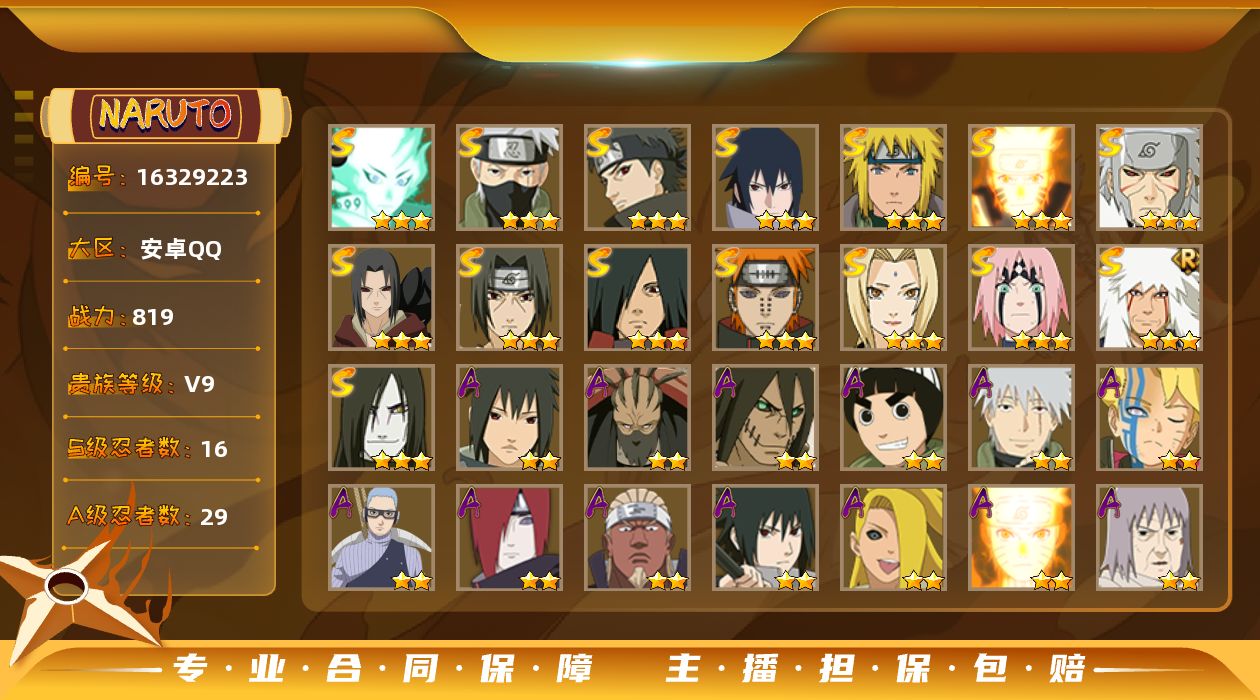 【S级忍者】:千手扉间「秽土转生」(3星),宇智波鼬「秽土转生」(3星),春野樱「忍界大战」(3星),宇智波鼬「须佐能乎」(3星),宇智波止水「须佐能乎」(3星),旗木卡卡西「须佐能乎」(3星),自来也「舞之豪杰」(3星),大蛇丸(3星),纲手(3星),宇智波斑(3星),波风水门(3星),漩涡鸣人「九喇嘛连结」(3星),佩恩「天道」(3星),宇智波佐助「永恒万花筒」(3星),大筒木舍人「最终章」(3星),漩涡鸣人·宇智波佐助(3星)